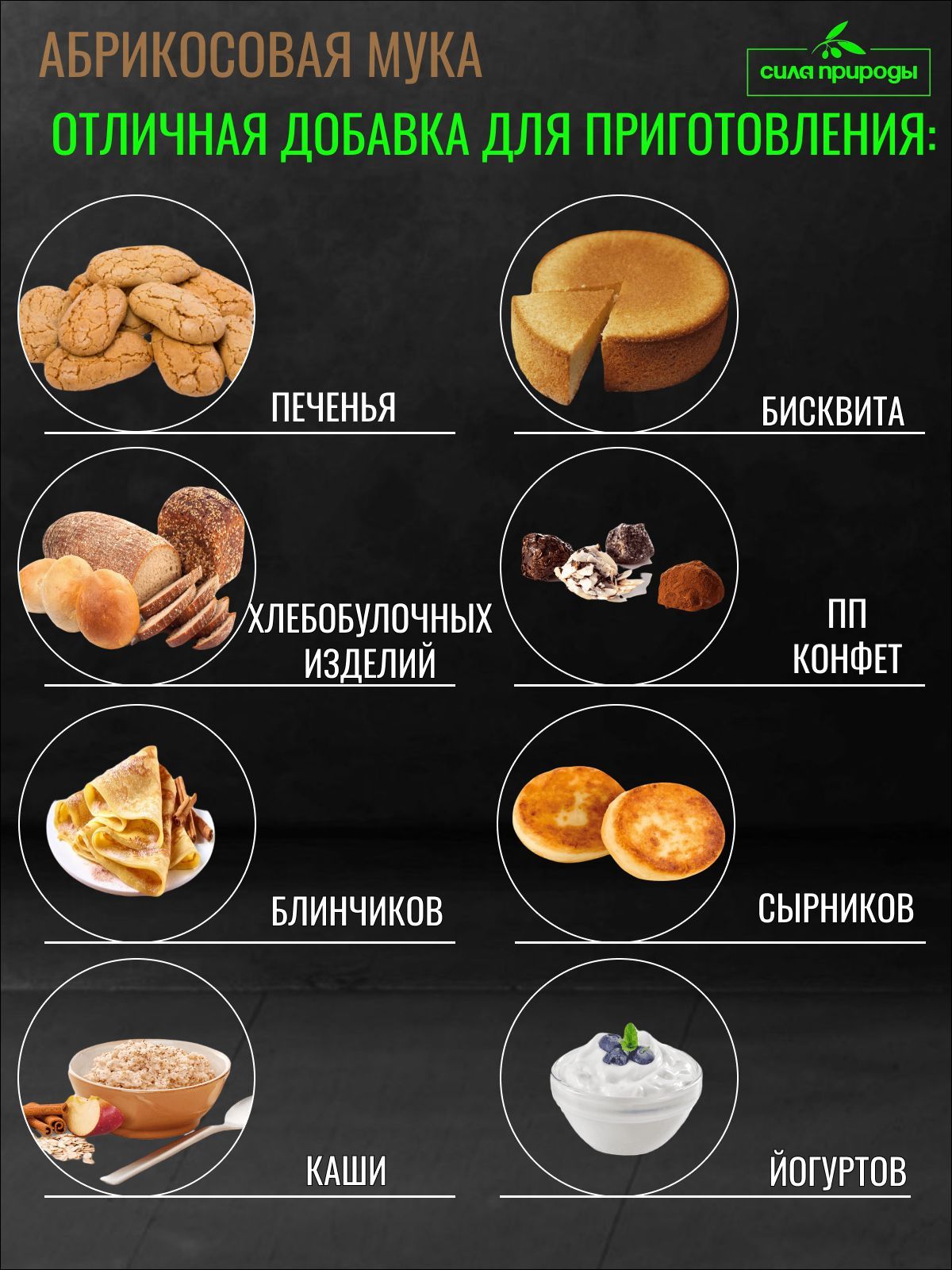 Описание: Мука абрикосовая используется для приготовления: кремов, выпечки, соусов, каши. А также в косметических целях. Богата мука витаминами А, В, С, F. Витамины необходимы для здоровья ногтей, кожи и волос. Содержит Омега 6 и Омега 9. Улучшает иммунитет. Мука из абрикосовых косточек помогает при заболевании дыхательных путей. Противокашлевое средство. Улучшает клеточный обмен веществ. Высокое содержание белка и клетчатки.