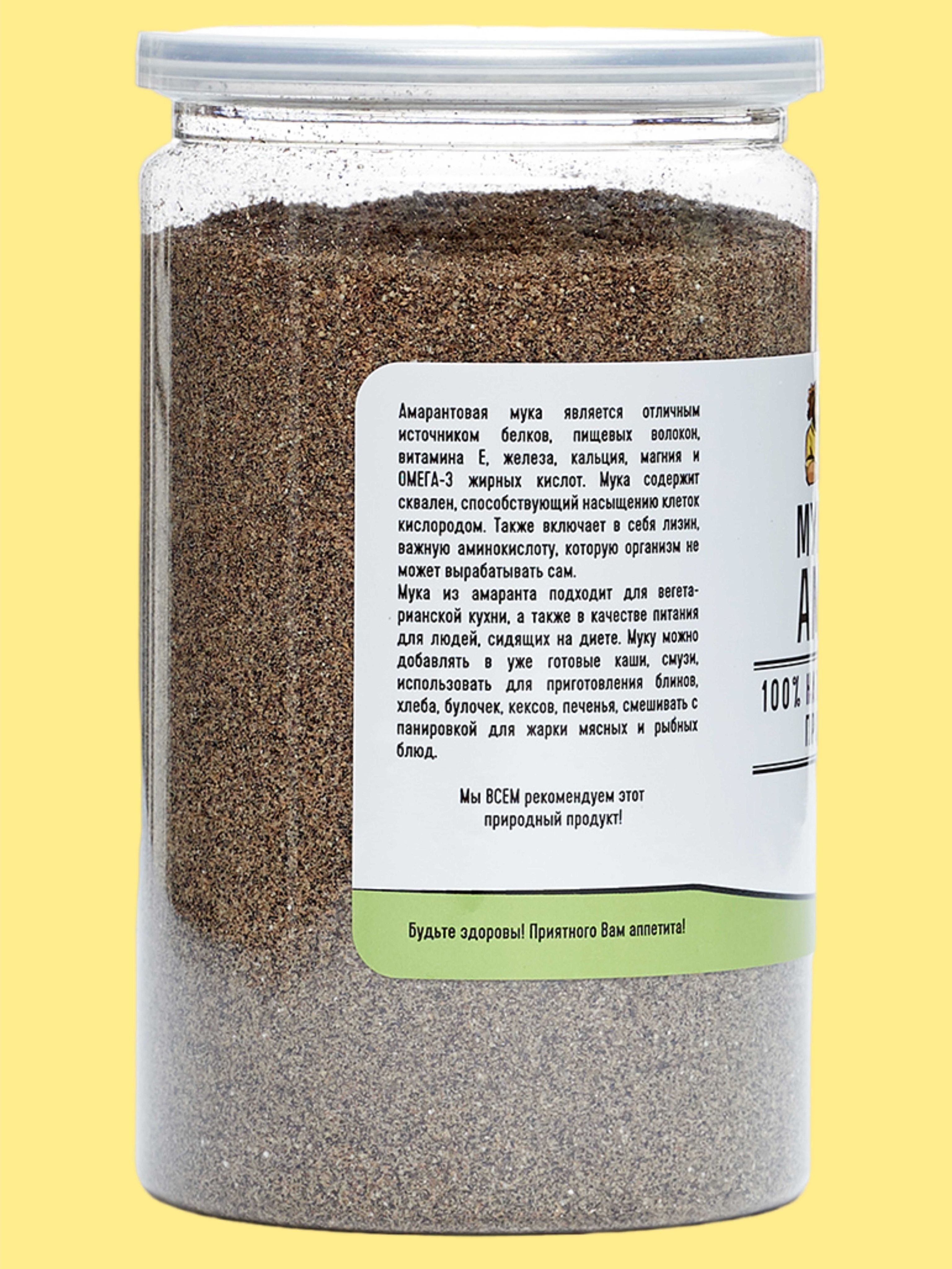 Амарантовая мука источник здоровья и долголетия. В амарантовой муке содержится редкий элемент сквален. Амарантовая мука является отличным источником белков, пищевых волокон, витамина Е, железа, кальция, магния и омега-3 жирных кислот. Мука подходит для вегетарианской кухни, а также в качестве питания для людей, сидящих на диете. Мука из амаранта черного содержит дубильные вещества, поэтому она отлично подойдет для приготовления косметических масок.  Муку можно добавлять в уже готовые каши, смузи, использовать для приготовления блинов, хлеба, булочек, кексов, печенья.