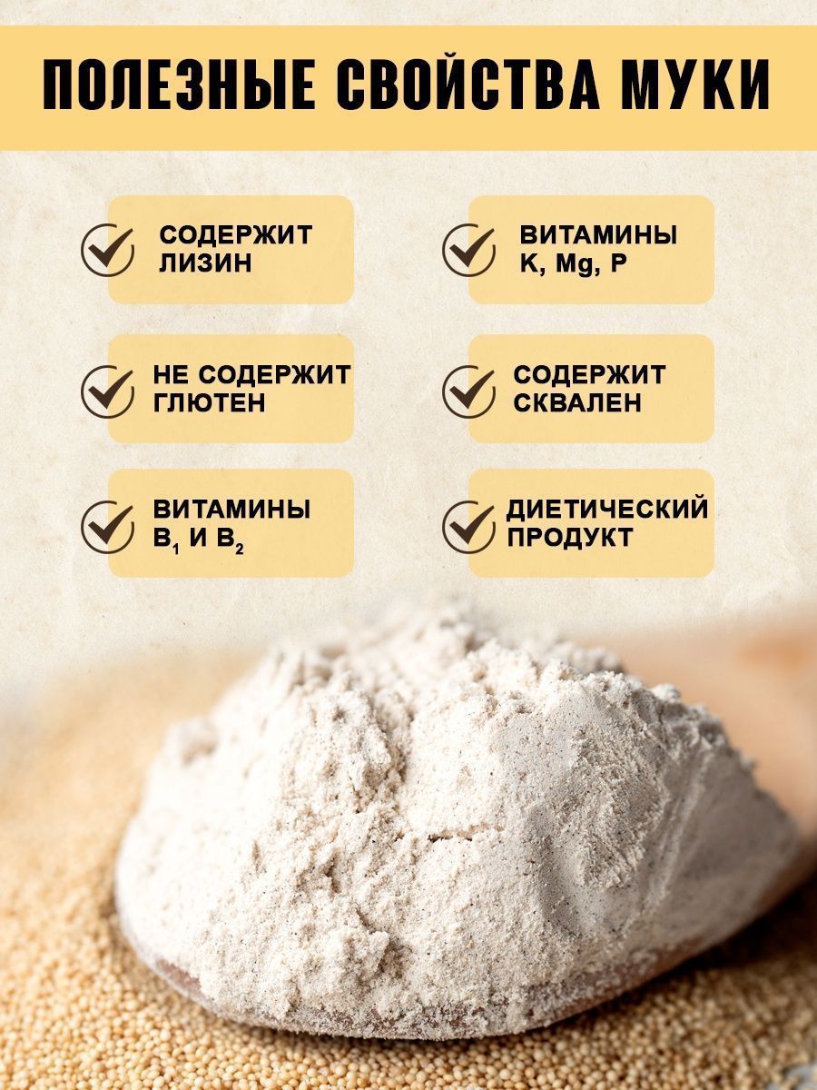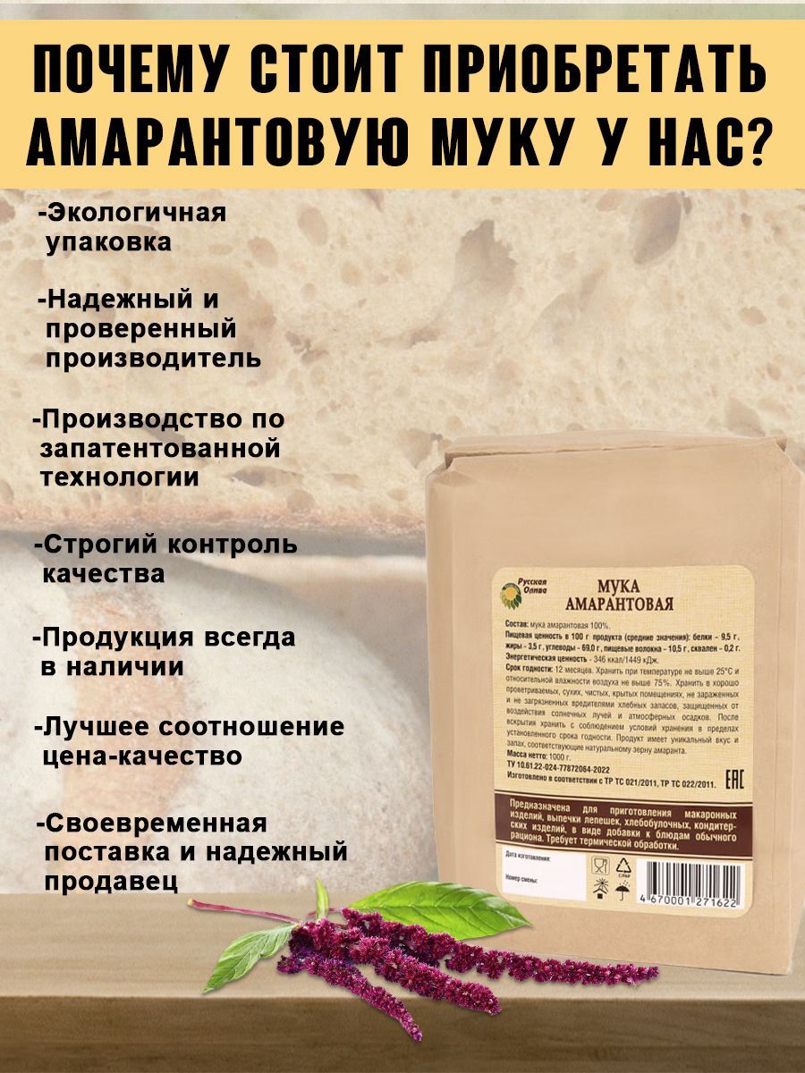 Описание: Мука амарантовая "Русская олива" без глютена 3 кг является натуральным продуктом и не содержит ГМО , имеет мелкий помол , однородную текстуру, светло-кремовый цвет и ненавязчивый оригинальный ореховый вкус.