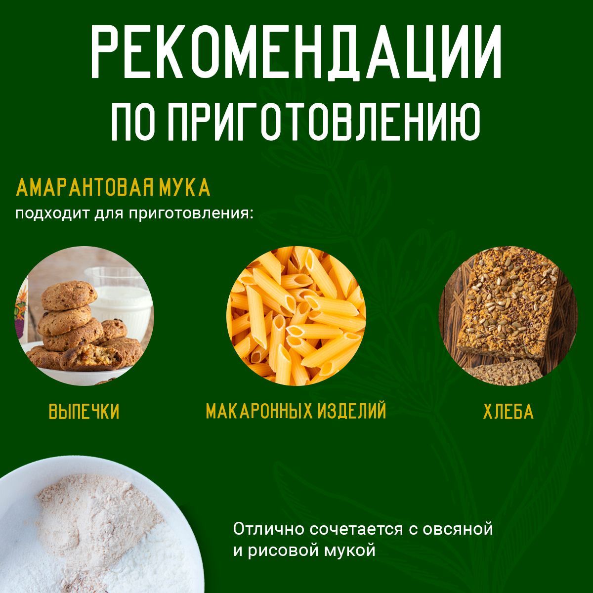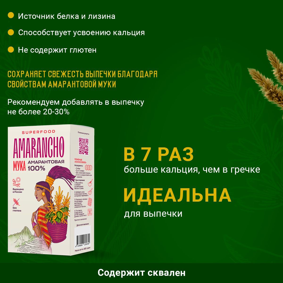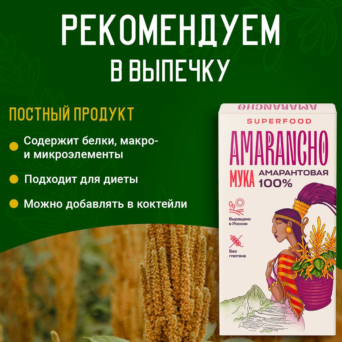 Описание: Мука амарантовая - идеальный выбор для тех, кто заботится о своем здоровье и стремится к полноценному и сбалансированному питанию. Безглютеновая, цельнозерновая и натуральная, она подходит и для сыроедов, и для веганов, и для всех, кто придерживается ЗОЖ. Амарант — древняя южноамериканская культура. Он был основой жизненной энергии ацтеков, майя и инков, а теперь готов стать незаменимым продуктом в Вашем ежедневном рационе. Оцените пользу и уникальный вкус блюд с безглютеновой мукой из семян амаранта! Амарантовая мука - универсальный продукт, суперфуд, который можно использовать не только в выпечке, но и в приготовлении различных блюд. Она станет отличной основой для питательных и полезных блюд, а также замечательным ингредиентом для создания самых разнообразных десертов. Будь то хлеб, печенье или кексы, лапша, все блюда приобретут неповторимый вкус и аромат благодаря этой муке. Используя муку амарантовую, вы сможете создавать самые питательные и полезные блюда, которые позволят вам поддерживать форму и энергию на протяжении дня. Если вы ищете питательный перекус или хотите приготовить что-то легкое для школьника, подростка или для офиса, то бутерброды и снэки из амарантовой муки идеальны для этого. Они позволят вам не только полноценно питаться, но и насладиться вкусом и насыщенностью блюда. Белок, клетчатка, ценные микроэлементы и легкоусвояемый кальций в составе муки помогут поддержать здоровье и красоту, а вкус амаранта добавит блюдам приятные ореховые ноты. Преимущества амаранта в том, что в нём содержится много легкоусвояемого белка с оптимальным соотношением аминокислот, особенно незаменимых — лизина и метионина. По содержанию лизина амарант превосходит другие культуры – кукурузу в 3 раза, рис в 2 раза! Лизин обладает противовирусным свойством, он регулирует процессы обновления костной ткани, предупреждает развитие простудных заболеваний, а также стимулирует выработку коллагена и мышечного протеина, которые способствуют быстрому восстановлению организма и мышц в частности.Почувствуйте всю силу уникальной культуры! Амарантовая мука является отличной заменой белка для любителей спорта. В связи с этим, амарантовая мука широко применяется в спортивном питании. Бренд «Amarancho» бережно выращивает амарант на собственных полях в Волгоградской, Воронежской, Оренбургской и Кемеровской областях. Производство полного цикла позволяет нам контролировать качество и экологическую безопасность на каждом этапе. Мы возделываем почву щадящими методами, используем семена собственной селекции. Запатентованная технология переработки зерна амаранта, современное оборудование и научный подход на каждом этапе, позволяющие производить продукцию высочайшего качества. Мука универсальная и подходит для приготовления каш, макаронных изделий, выпечки, пиццы, лепешек, кондитерских изделий, спортивного питания, сыроедческих десертов, а также может использоваться как хлебопекарная. Для выпечки рекомендуется использовать от 10 до 30% амарантовой муки в комбинации с другими видами муки без содержания глютена или с обычной пшеничной мукой (кг). При такой пропорции, блюда станут более сбалансированными по аминокислотному составу, будут дольше оставаться свежими, а во вкусе появятся ореховые ноты. Продукт имеет уникальный а