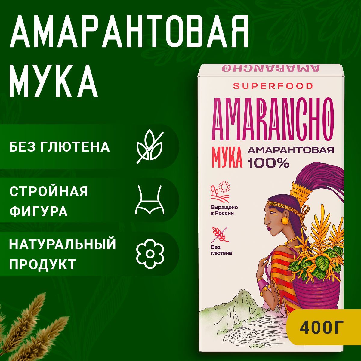 Мука амарантовая "Amarancho" 400 г. без глютена, постный продукт для выпечки хлеба и пиццы