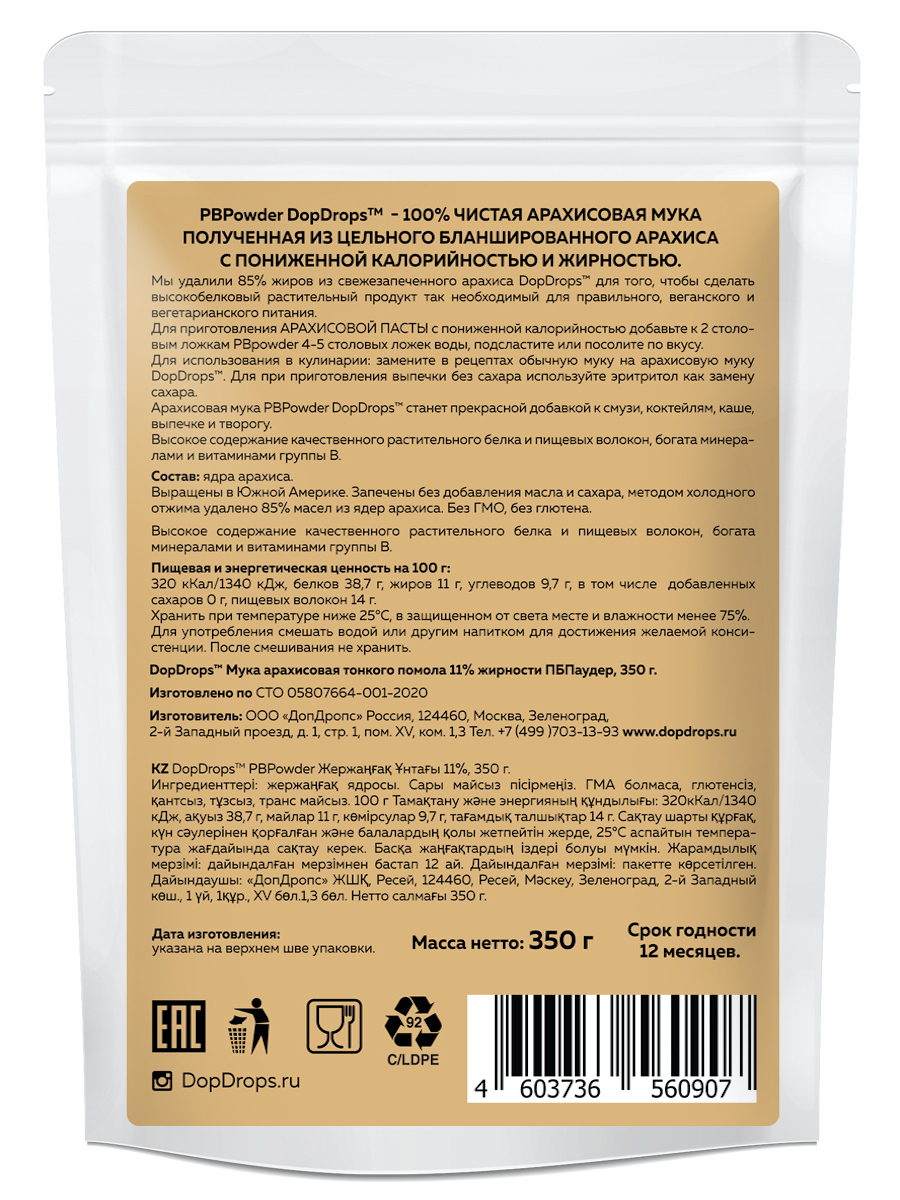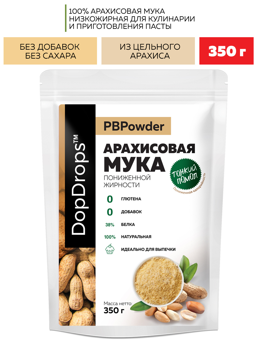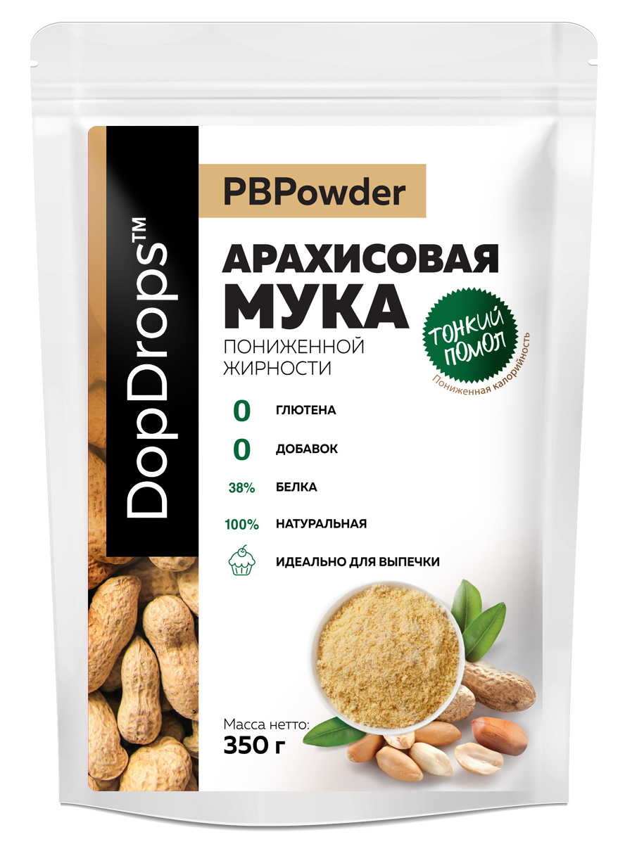Мука Арахисовая DopDrops тонкого помола PBPowder высокобелковая с пониженной калорийностью и жирностью, 350 г