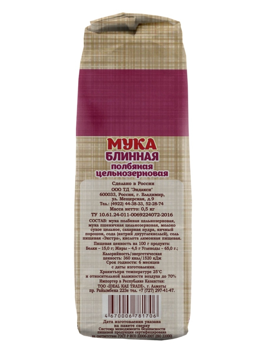 Описание: МУКА БЛИННАЯ ПОЛБЯНАЯ ЦЕЛЬНОЗЕРНОВАЯСостав: мука полбяная цельнозерновая, мука пшеничная цельнозерновая, молоко сухое цельное, сахарная пудра, яичный порошок, разрыхлитель: сода (натрий двууглекислый), соль пищевая "Экстра", регулятор кислотности: кислота лимонная пищевая.