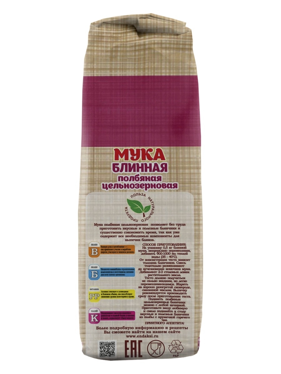 Мука полбяная цельнозерновая позволяет без труда приготовить вкусные и полезные блинчики и существенно сэкономить время, так как уже содержит все необходимые компоненты для выпечки блинов.