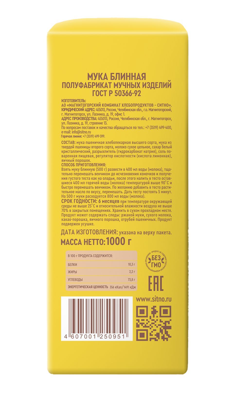 Именно такую смесь вы найдете в составе муки блинной, торговой марки «СИТНО». Это единственный производитель, предлагающий смесь, в состав которой входит не только мука пшеничная высшего сорта, но и мука из твердых сортов пшеницы.