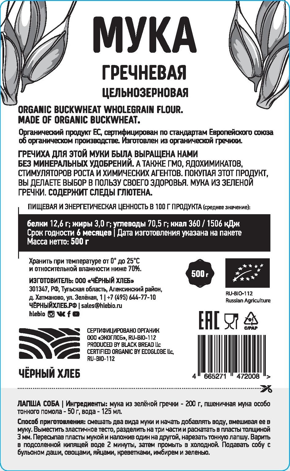 Мука гречневая цельнозерновая (из зеленой гречихи), Черный хлеб, 2 шт х 500 г
