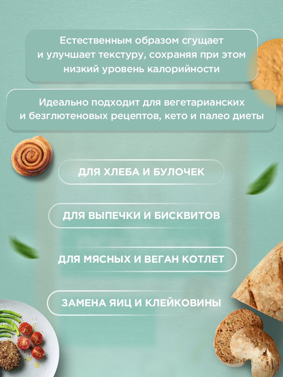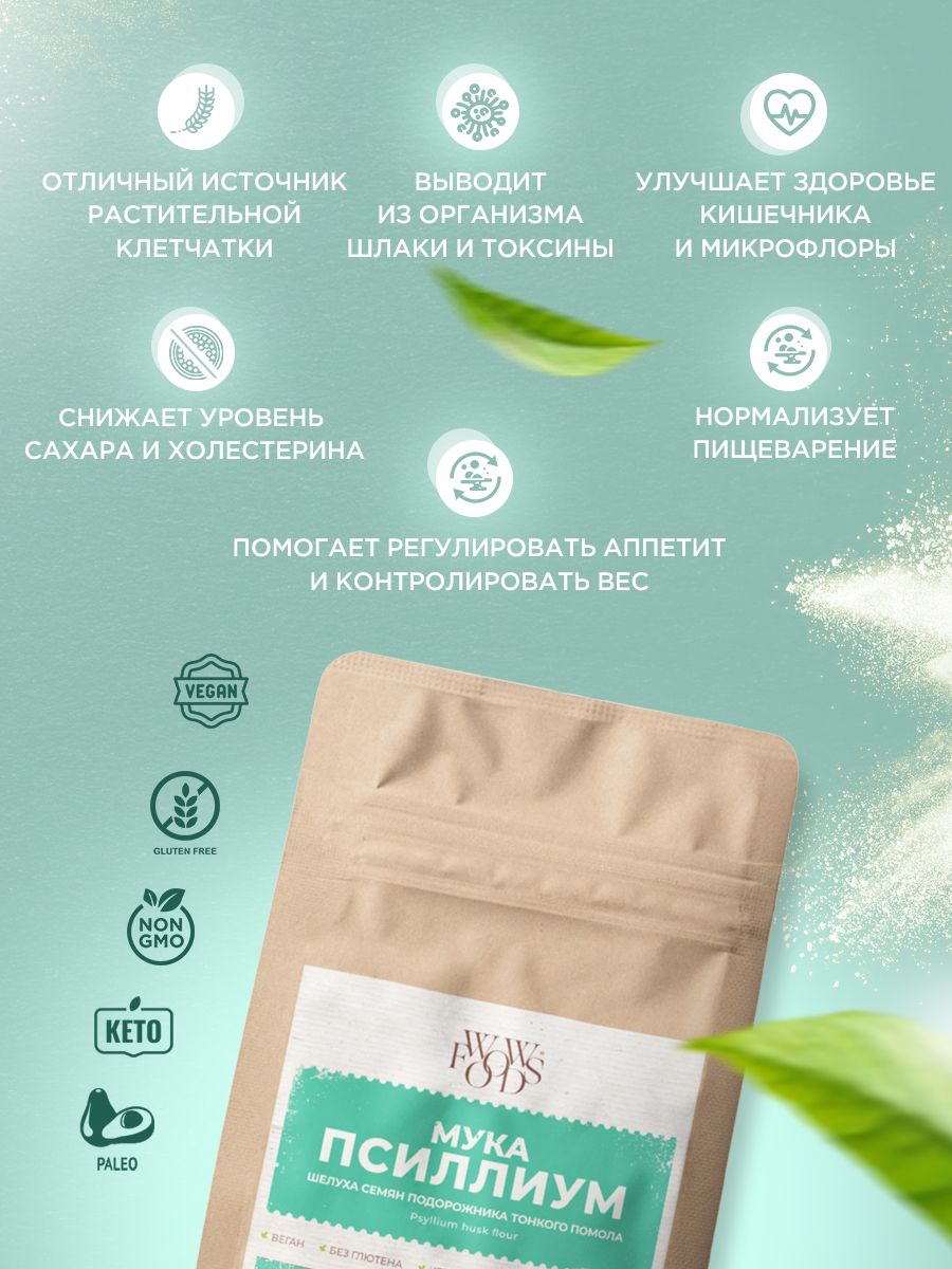 • Мука из шелухи псиллиума не содержит глютен и подходит для вегетарианского и диетического питания, кето и палео диеты.