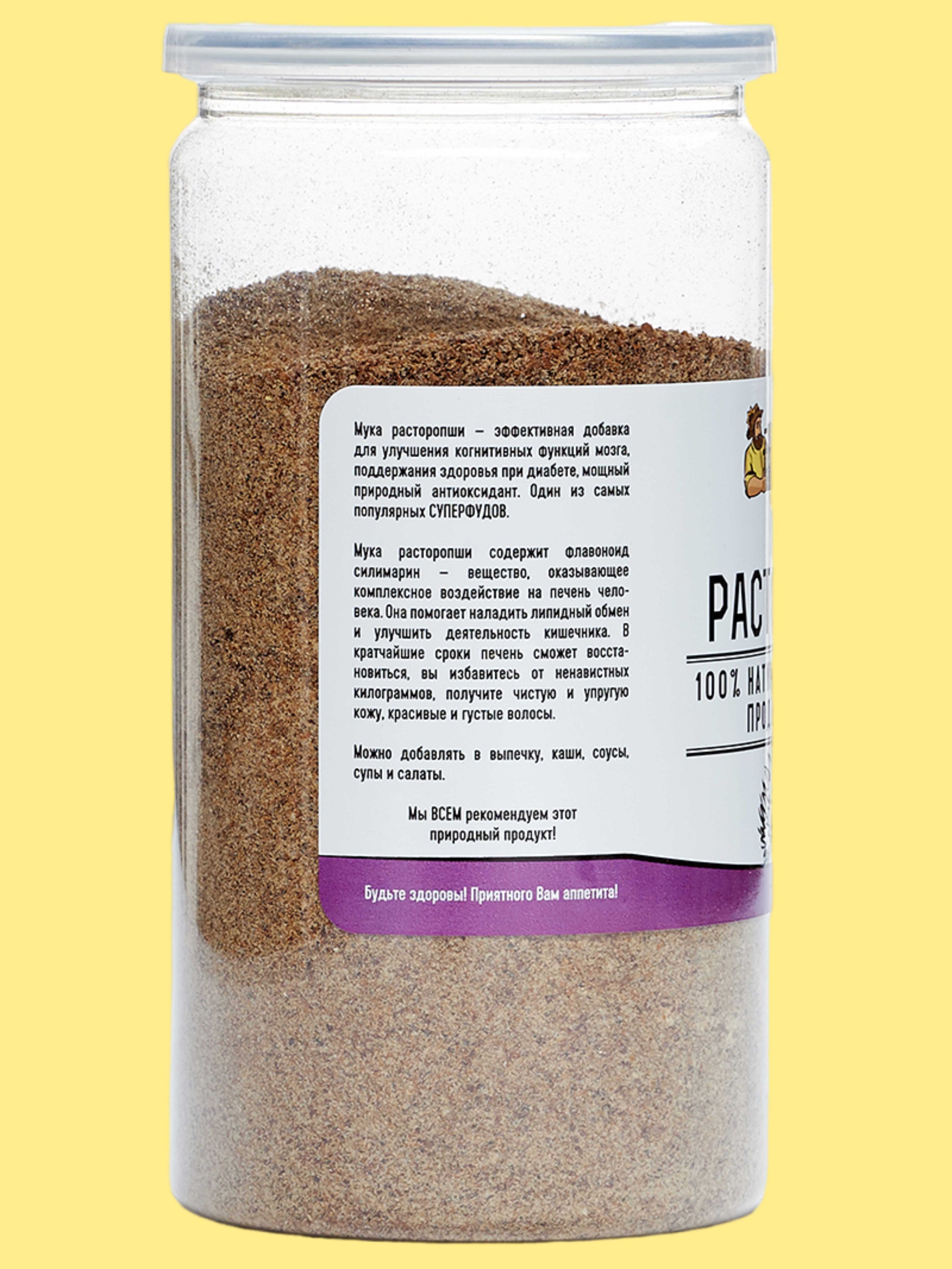 Мука расторопши – это эффективная добавка для улучшения когнитивных функций мозга, поддержания здоровья при диабете, мощный природный антиоксидант. За счет большого количества полезных свойств, доказанной эффективности расторопши при терапии разных заболеваний и ее безопасности сегодня это один из самых популярных суперфудов. Ее выбирают не за рекламу, а за реальную пользу – доказанную многочисленными научными исследованиями. Мука расторопши  содержит флавоноид силимарин – вещество, оказывающее комплексное воздействие на печень человека. Она помогает наладить липидный обмен и улучшить деятельность кишечника. В кратчайшие сроки, печень сможет восстановиться, вы избавитесь от ненавистных килограммов, получите чистую и упругую кожу, красивые и густые волосы. А еще вы можете ее добавлять просто в выпечку, каши, делать с ее добавлением салаты, соусы, супы. Наш уникальный продукт мы с любовью упаковываем в баночки объемом 200, 350, 500гр., по самой доступной цене.  Наша полезная мука расторопши будет прекрасным подарком всем вашим близким и родным, которые заботятся о своем здоровье.