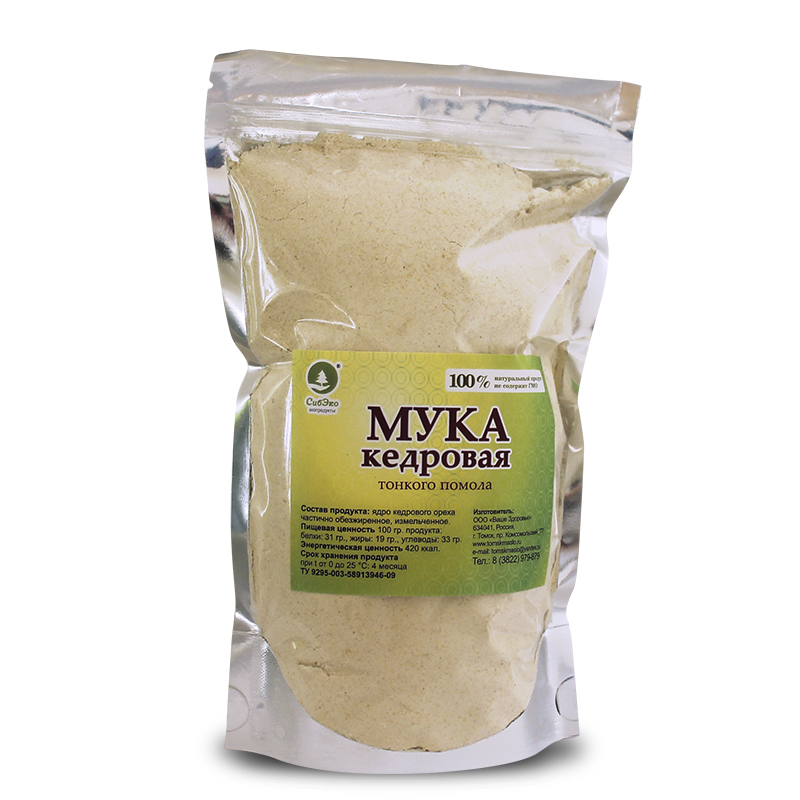 Описание: Мука кедровая - уникальный по своим полезным свойствам продукт, полученный путем перемалывания кедрового жмыха. Мука сохраняет вкусовые и питательные качества кедрового ядра, что делает ее незаменимым продуктом для оздоровления организма и приданию блюдам изысканных вкусовых качеств. В состав муки входят витамины А, P, E, полиненасыщенные жирные кислоты, набор микро- и макроэлементов.  Постоянное употребление продукта позволяет улучшить состояние иммунной системы, а также помогает восстановить силы после тяжелых заболеваний. Натуральная кедровая мука является незаменимой частью рациона беременных и кормящих мам, а также людей, перешедших на вегетарианский тип питания. Продукт содержит растительный белок, который усваивается организмом на 99%. Попробуйте нашу кедровую муку — этот продукт действительно уникален! А детки с удовольствием будут пить кедровое молочко по нашим рецептам.