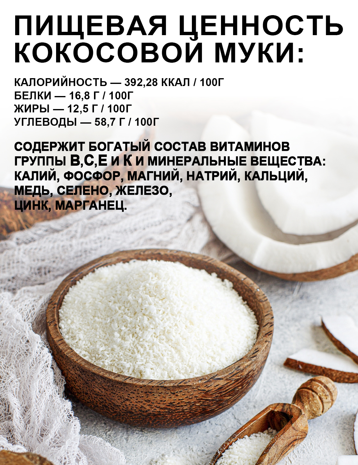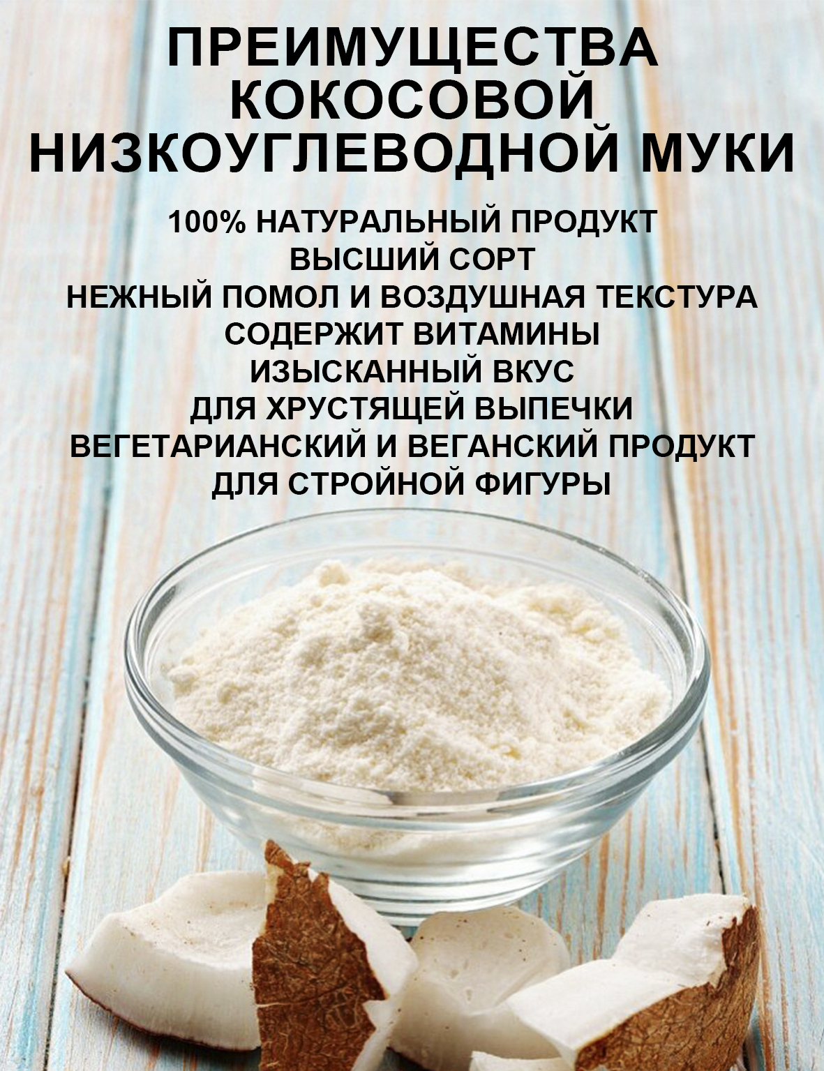 Кокосовая мука без глютена это здоровая и вкусная замена обычной муки, так как имеет такую же структуру, как и мука пшеничная.