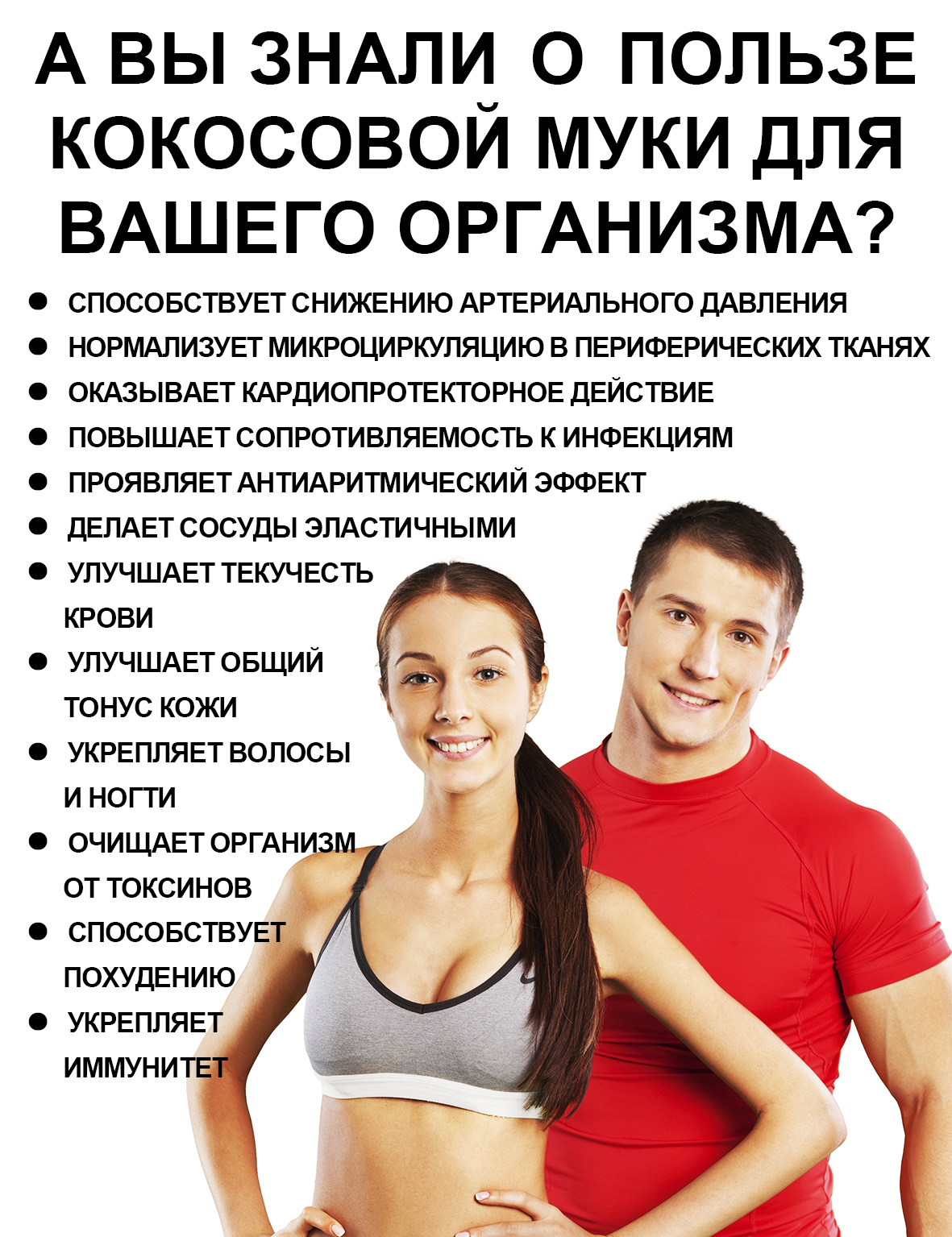 Клетчатка, содержащаяся в кокосовой муке, деликатно очищает кишечник, предотвращает запоры и поддерживает нормальную перистальтику, а триглицериды обладают антивирусной, антибактериальной, антигрибковой активностью. Они улучшают метаболизм и синтез энергии, не откладываются в жировые клетки, а сразу расходуются на энергию.