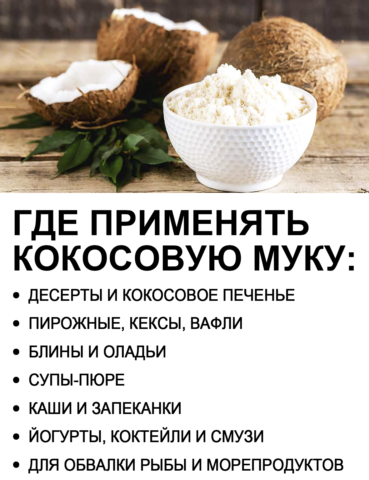 Мука кокос подходит для приготовления кондитерских изделий. Её добавляют в йогурты, коктейли, смузи, каши, супы-пюре и запеканки. Идеально для обвалки рыбы и морепродуктов, перед жаркой.