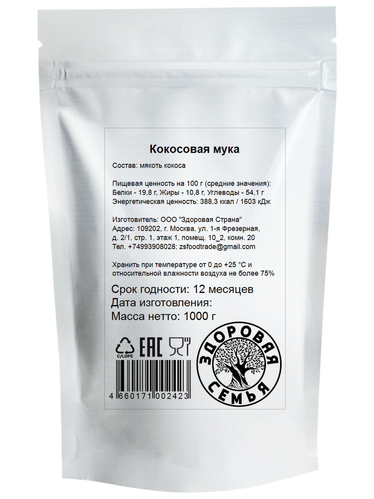Мука кокосовая органическая (без глютена), Здоровая Семья, 1 кг (1000 г), organic coconut flour