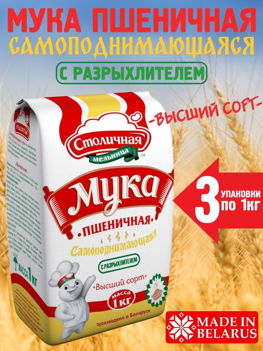 Мука кондитерская пшеничная Самоподнимающаяся высший сорт М54-28 с разрыхлелем, 3 пачки по 1 кг