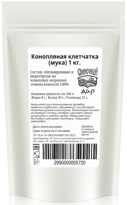 Мука из полезных семян конопли в составе которых нет никаких психотропных веществ. Уменьшает риск возникновения тромбов, сердечно-сосудистых заболеваний, способствует снижению уровня холестерина. Благотворно влияет на нервную систему человека, улучшает зрение, иммунитет и работу сердца. Уменьшает риск бесплодия и улучшает потенцию. Способно повышать гемоглобин.