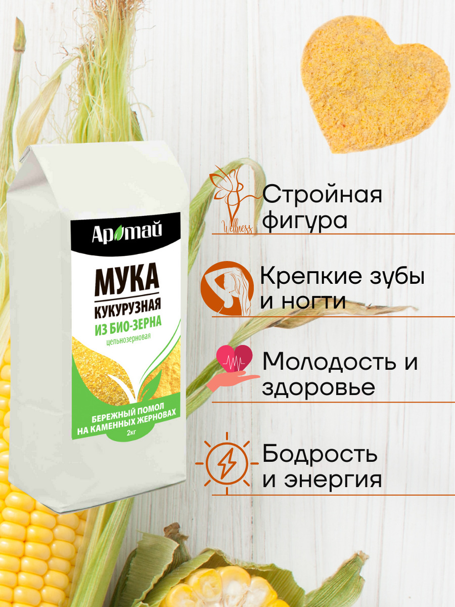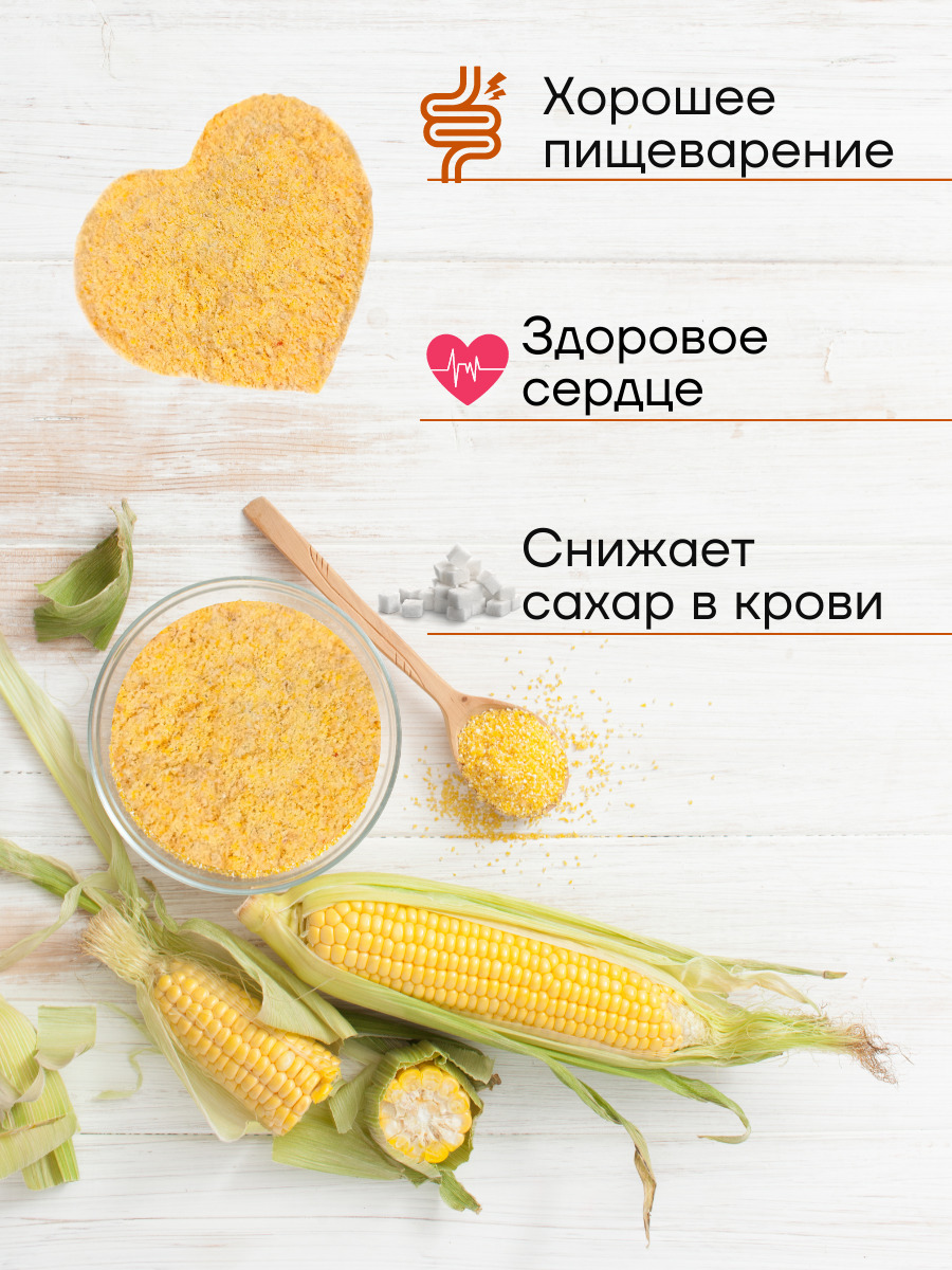 Описание: Наша био мука кукурузная цельнозерновая смолота из био-зерна кукурузы, выращенного без использования химических удобрений, ядохимикатов и ГМО в экологически чистом районе. Прекрасно подходит для детского питания. Натуральный продукт без термической обработки. Вегетарианский и веганский продукт. Кукурузная мука содержит витамины Е, Н, РР, D, А, С и В9 в оптимальном для человека количестве. Из минералов содержатся калий, натрий и магний. Кукурузная мука обладает низкой калорийностью. Это диетический продукт питания эффективный для похудения. Улучшает состав крови и работу кишечника. Укрепляет сосуды, делает их более эластичными, снижает уровень холестерина. Укрепляет именную систему, кости и зубы, что делает ее полезным для детского питания. Улучшает память. Витамины омолаживают клетки кожи. Белок поддерживает мышечный тонус, что делает этот продукт полезным при занятиях спортом. Постный продукт. При беременности облегчает токсикозы и увеличивает лактацию.