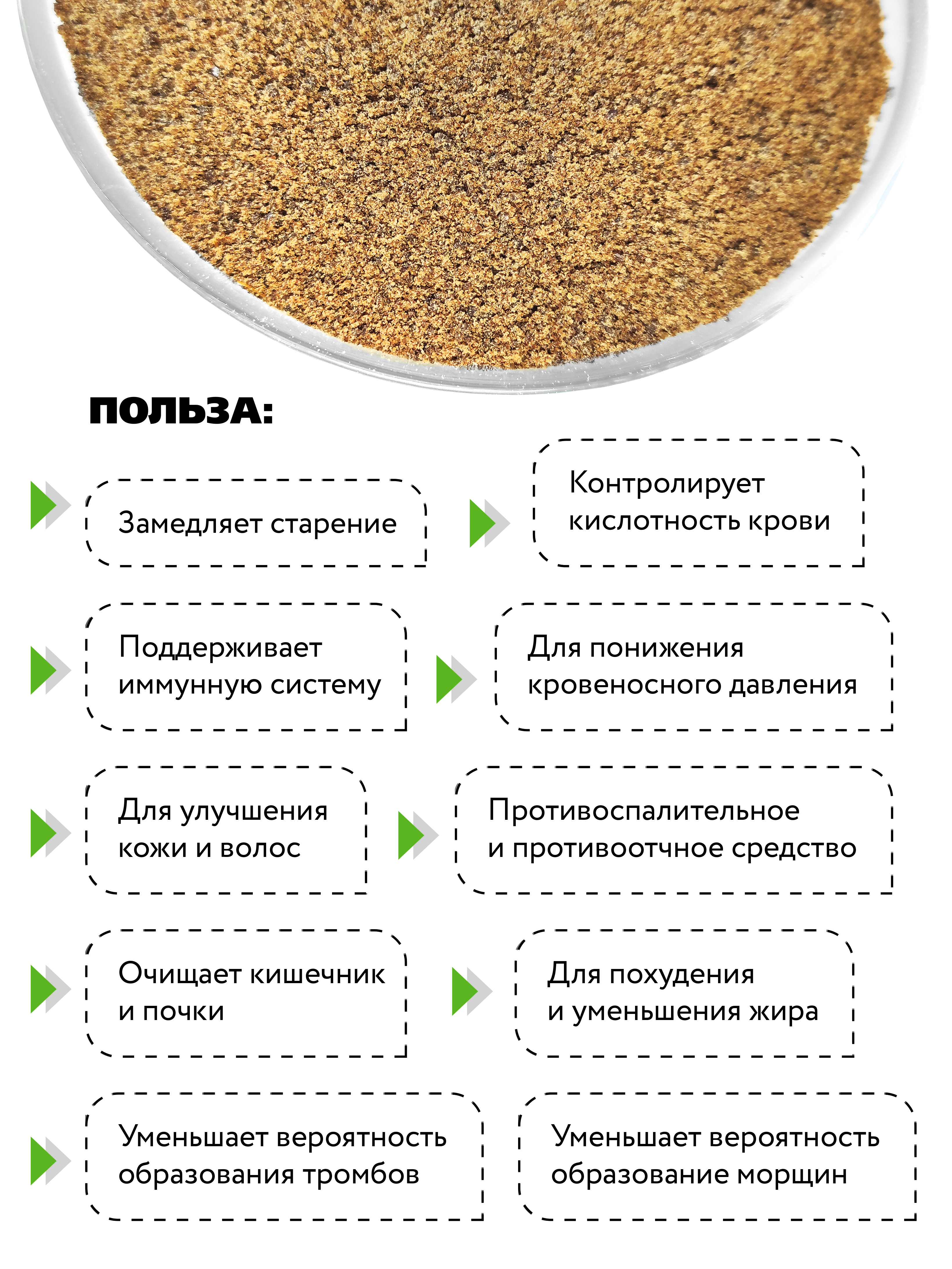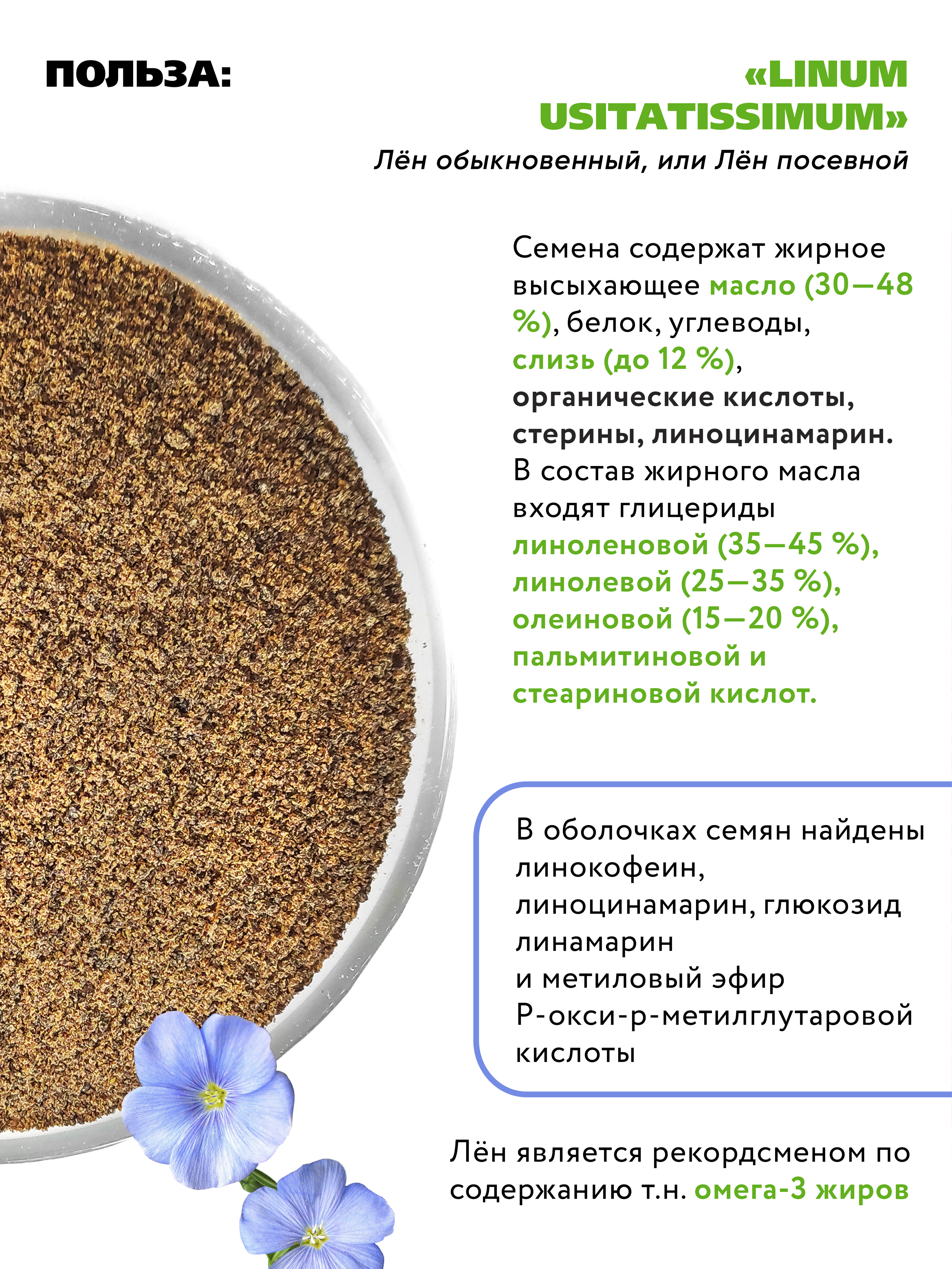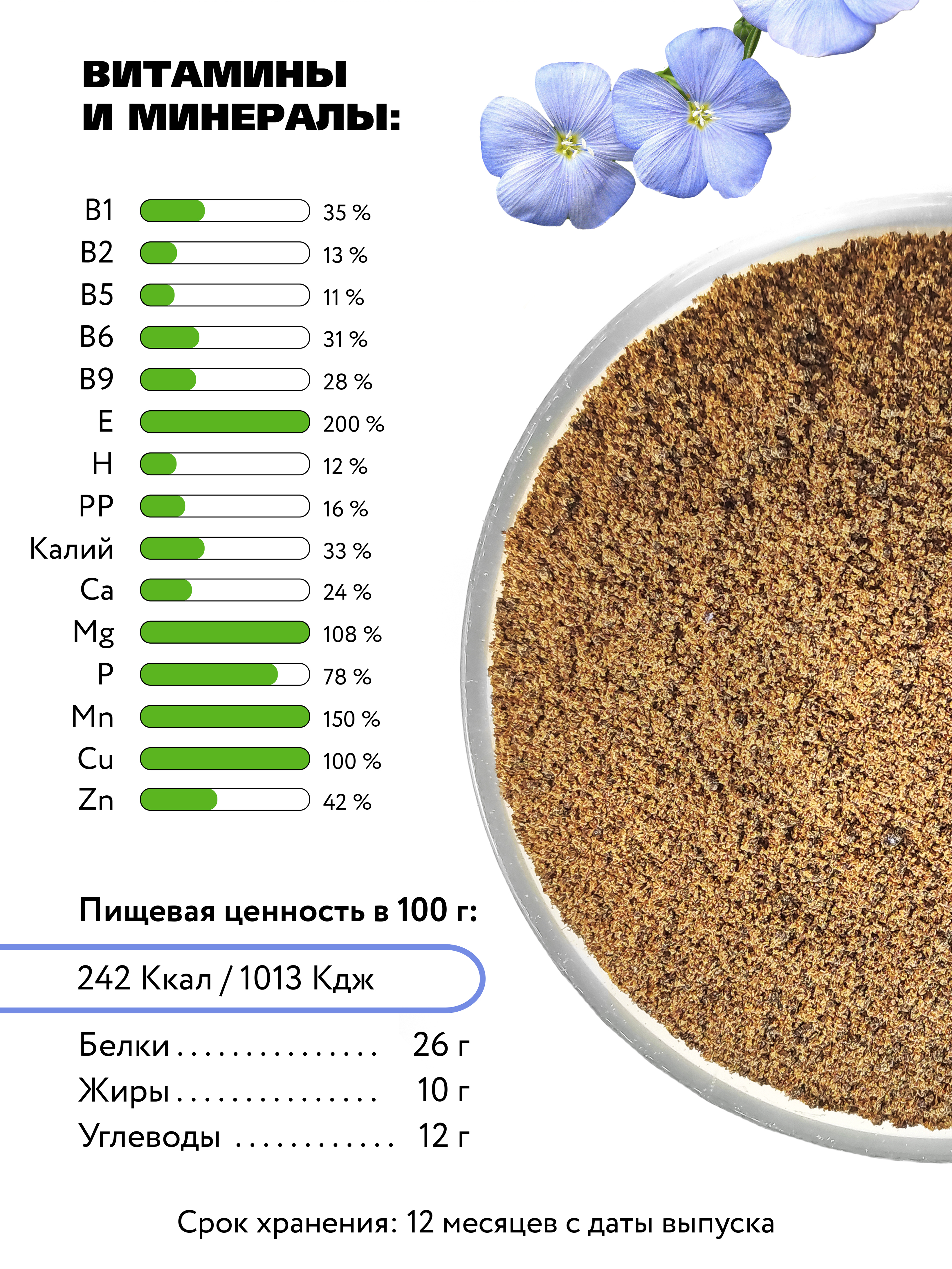 Широкий спектр применения: Льняную муку можно использовать в выпечке, добавлять в каши, мюсли, смузи, йогурты и другие блюда.