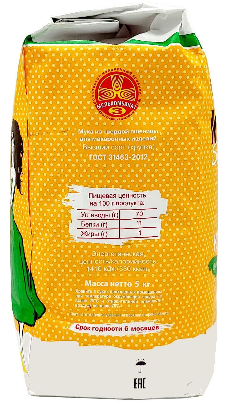 Описание: Мука Mamma Mia Semola в/с крупка вырабатывается из зерна твердой пшеницы в соответствии с ГОСТ 31463-2012.