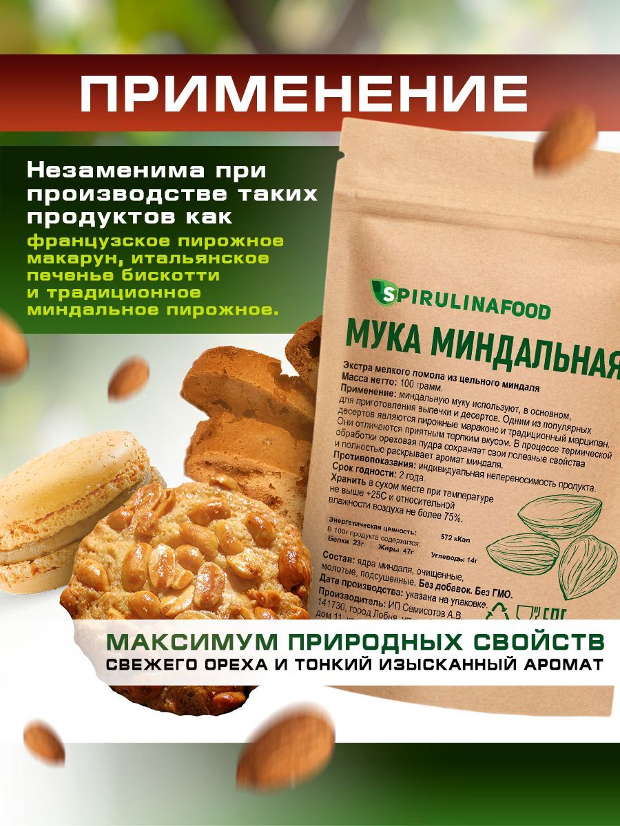 Мука миндальная экстра мелкого помола из цельного бланшированного миндаля Spirulinafood, 100 гр