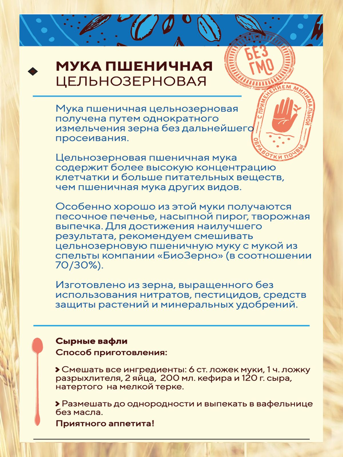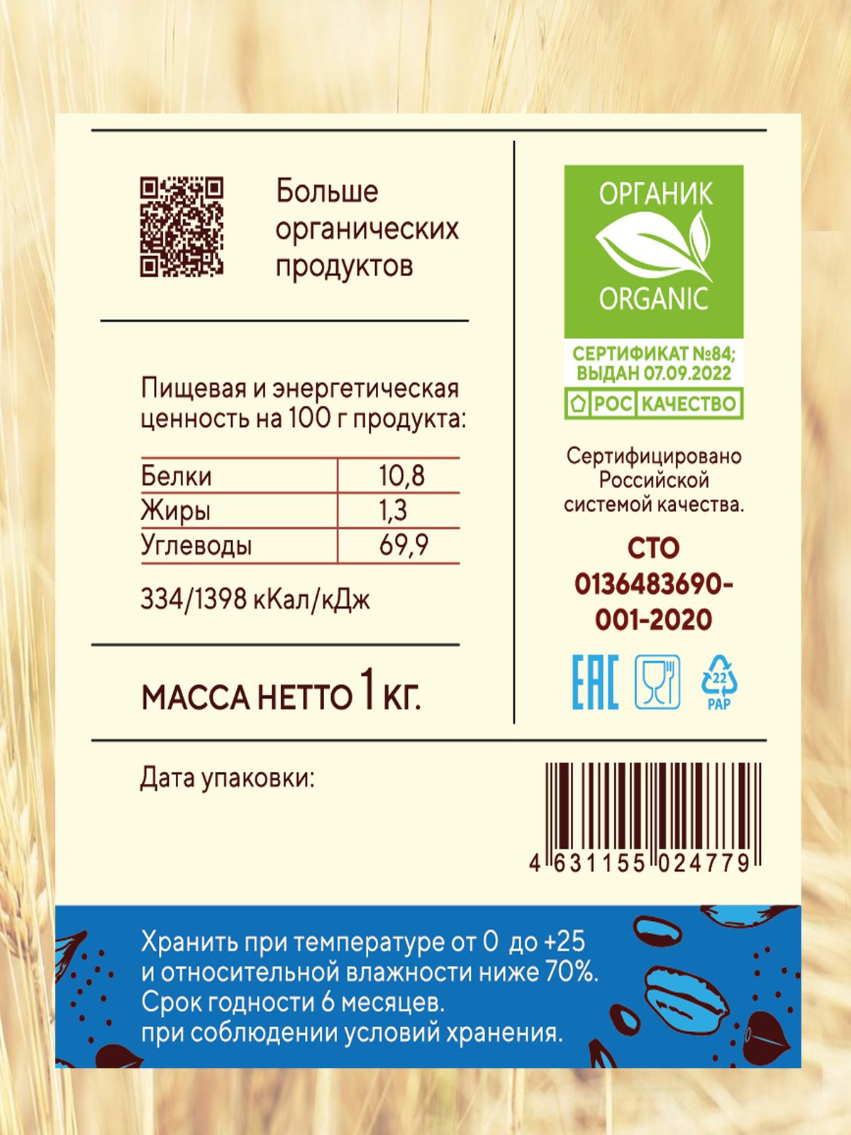 Зерно пшеницы. Продукт изготовлен из экологически чистого зерна, выращенного по принципам органического земледелия без использования нитратов, пестицидов, средств защиты растений, минеральных удобрений с применением минимальной обработки почвы.