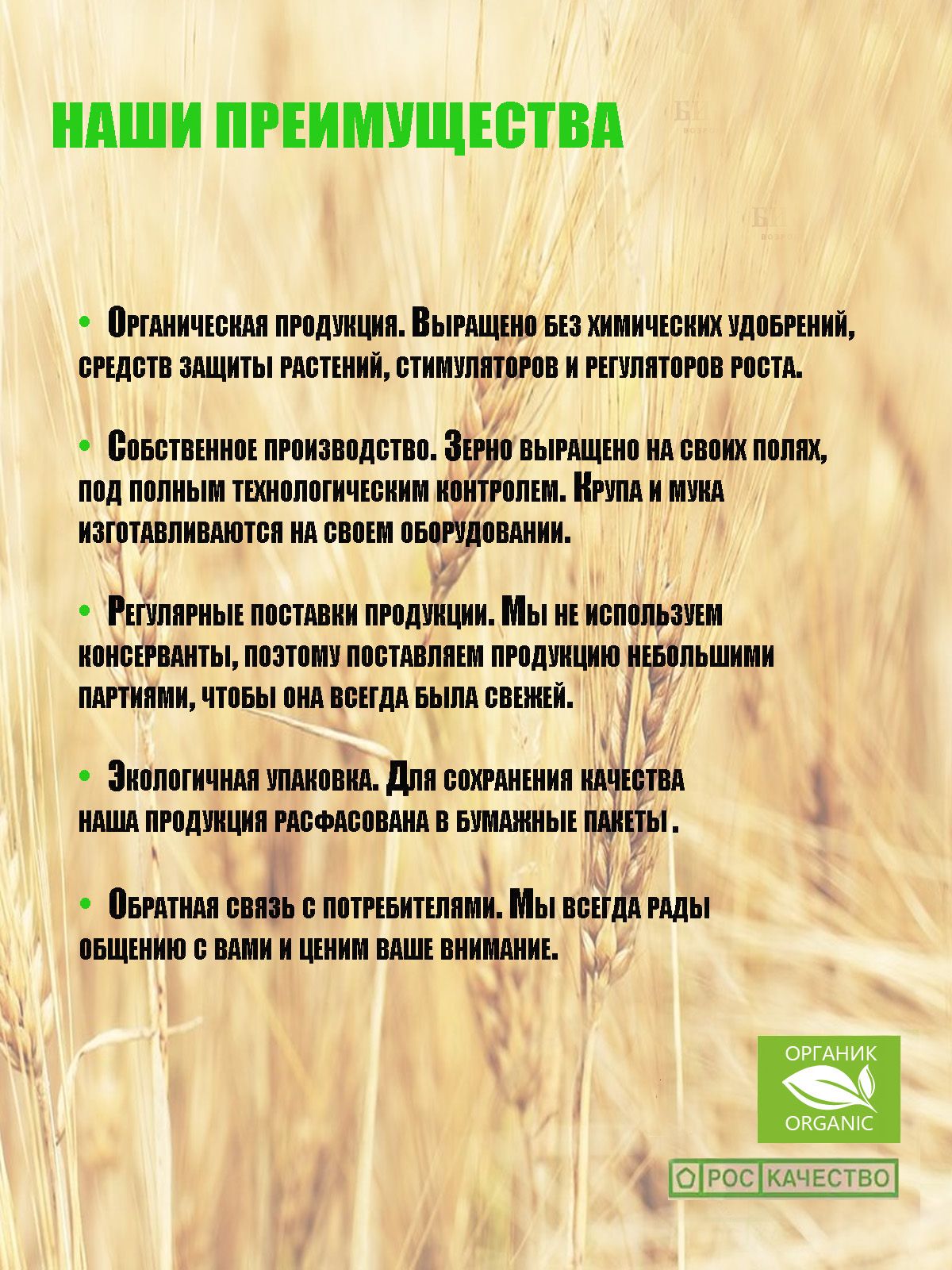 Зерно пшеницы. Продукт изготовлен из экологически чистого зерна, выращенного по принципам органического земледелия без использования нитратов, пестицидов, средств защиты растений, минеральных удобрений с применением минимальной обработки почвы.