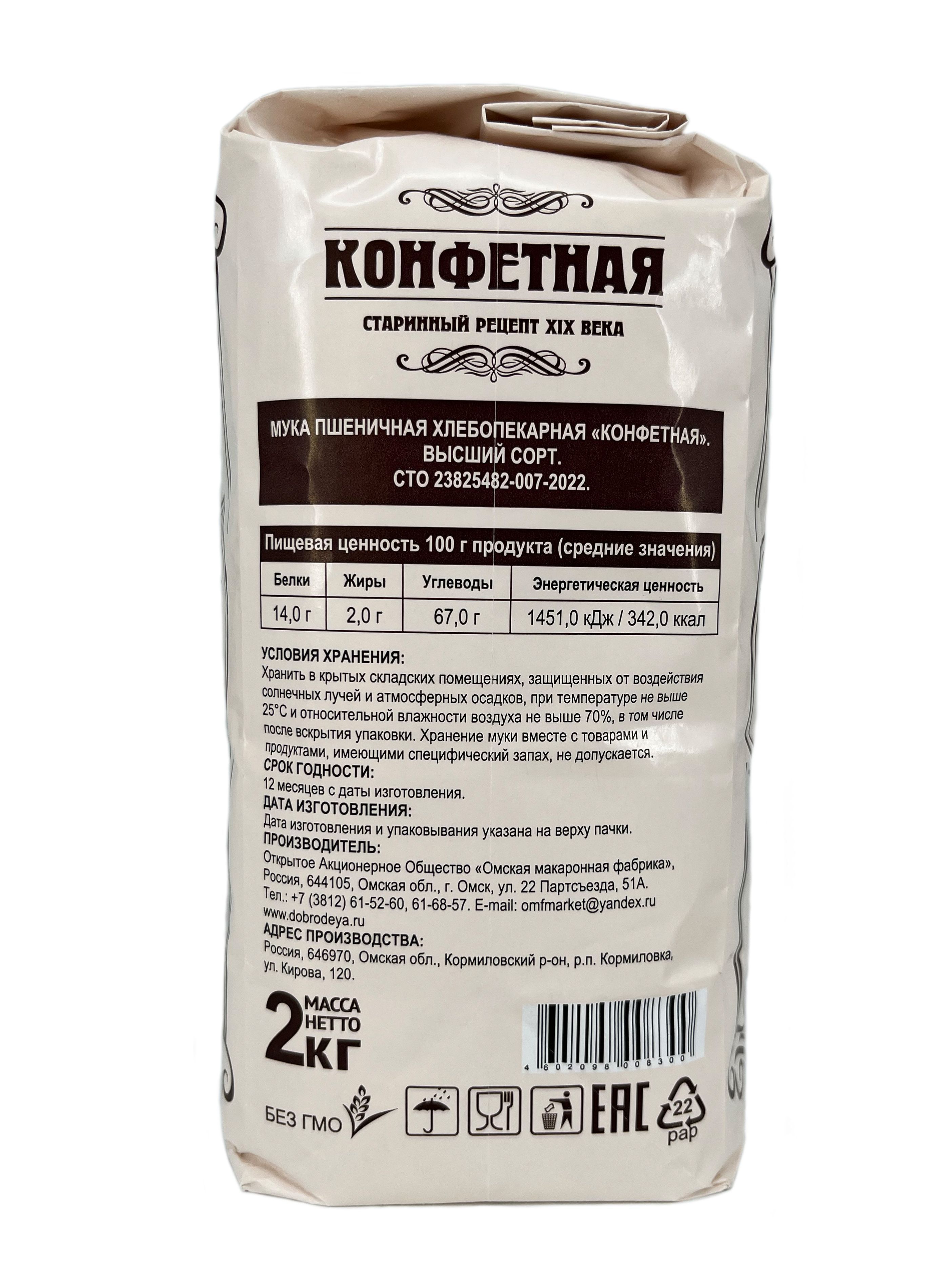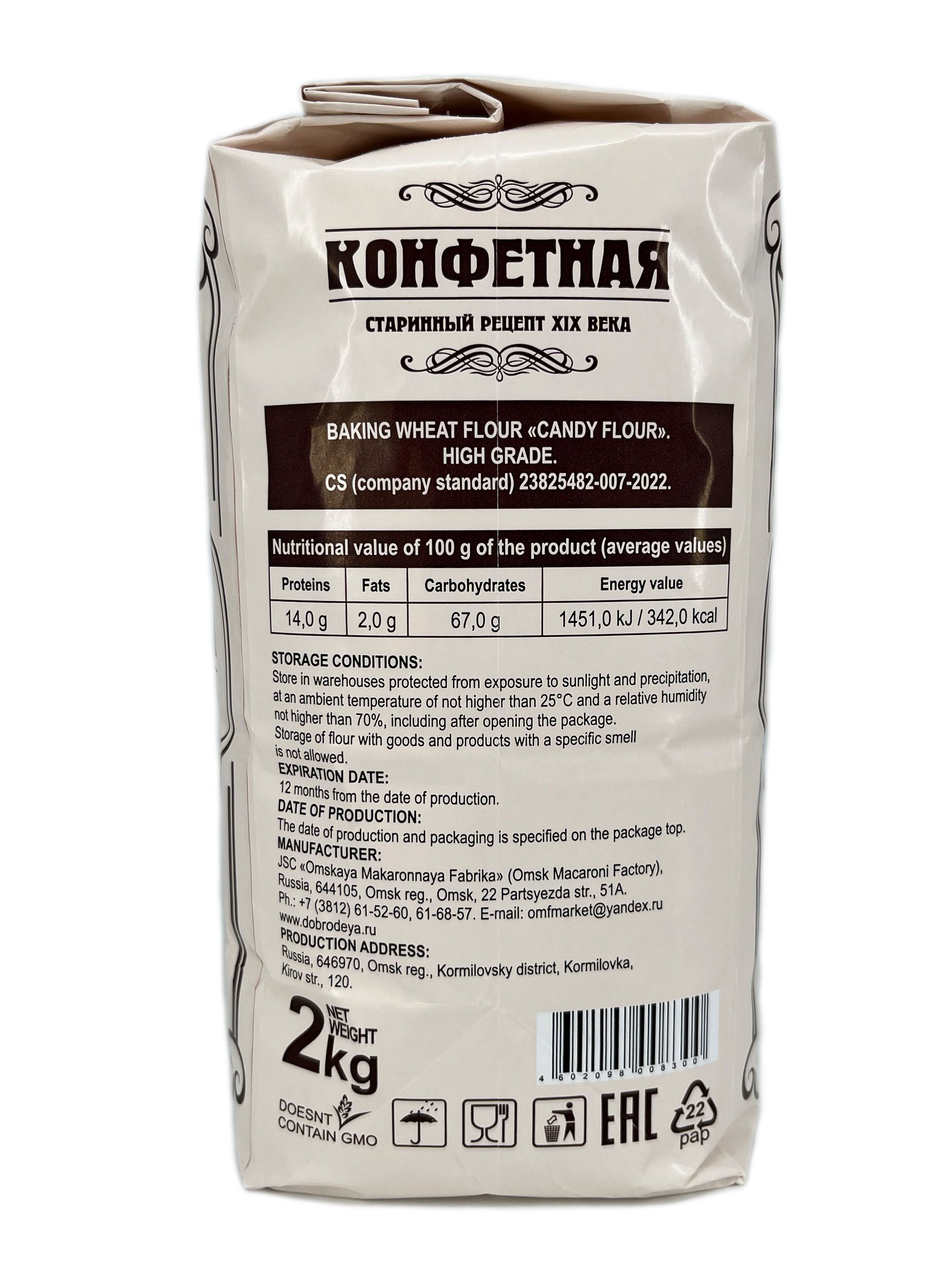 Мы создали муку «Конфетная» из смеси мягкой и твёрдой пшеницы по старинному рецепту 19 века и адаптировали ее к современным технологиям. Тогда из «конфе(к)тной» муки, именно так она и называлась,  выпекали самые дорогие хлебобулочные изделия. Мука «Конфетная» идеально подходит для выпечки, которой требуется длительная расстойка и отличная растяжимость. Поэтому вряд ли вы найдете более подходящую муку для изделий из слоеного теста, как дрожжевого, так и пресного. Твердая пшеница, которая входит в состав, содержит каратиноиды, и этим объясняется насыщенный желтый цвет муки. Наличие каратиноидов также повышает срок годности и сохранности выпечки. И тот же каратиноидный пегмент гарантирует, что тестовые заготовки при кратковременном хранении не посереют.   При замесе мука «Конфетная» потребляет большое количество воды, что способствует  отличному формированию структуры теста и сохранению влаги в готовом изделии. С мукой «Конфетная» вы получите невероятное удовольствие от приготовления вкусной, красивой и ароматной выпечки с хрустящей корочкой и пышным мякишем.