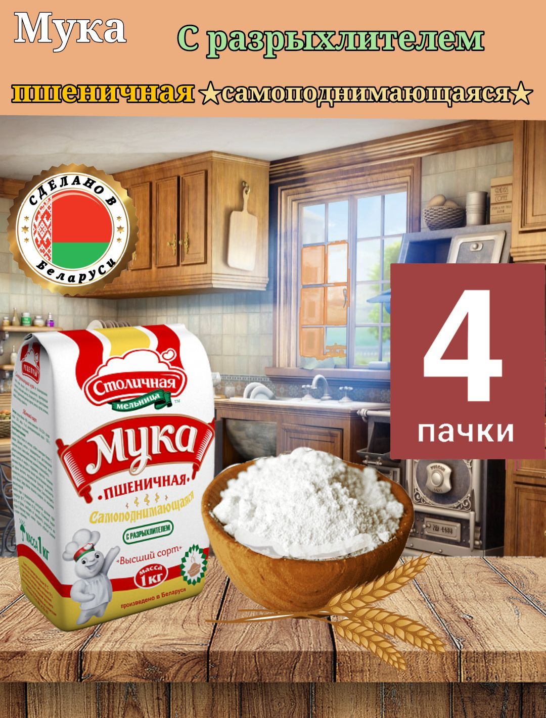 Мука пшеничная Самоподнимающаяся с разрыхлителем высший сорт, Столичная мельница, 4 пачки по 1 кг.