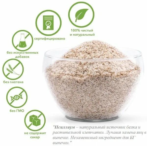 Описание: Мука ПсиллиумПод заковыристым названием скрывается шелуха семян подорожника, растущего в Закавказье, Индии и некоторых других регионах мира. Псиллиум безвкусен, потому что практически на 100% состоит из клетчатки. Причём особенной – усваиваемой организмом. Такая клетчатка очищает ЖКТ и помогает развиваться полезной микрофлоре. По сравнению с привычными отрубями псиллиум отличается близким к нулевому уровнем углеводов.