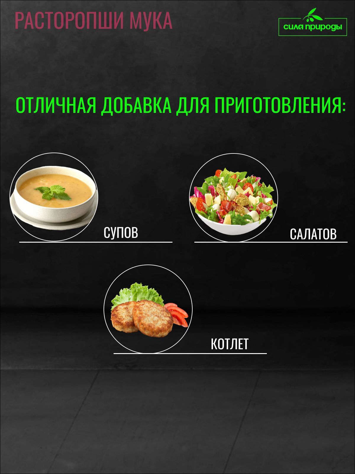 Описание: Мука расторопши используется для приготовления: котлет, салатов, супов. Богата мука Омега 6 и Омега 9. Полезности продукту из расторопши добавляют макро- и микроэлементы, такие как калий, магний, марганец, фосфор, селен, цинк и хром, медь, бор, железо, алюминий. Одно из лучших средств для лечения печени, желудка, кишечника. Помогает уменьшить вред, наносимый алкоголем и лекарственными препаратами. Является прекрасным средством для укрепления иммунитета. Витамин В и микроэлементы способствуют полноценной работе сердечной мышцы, а также оказывает положительное влияние на состояние нервной системы и зрение.