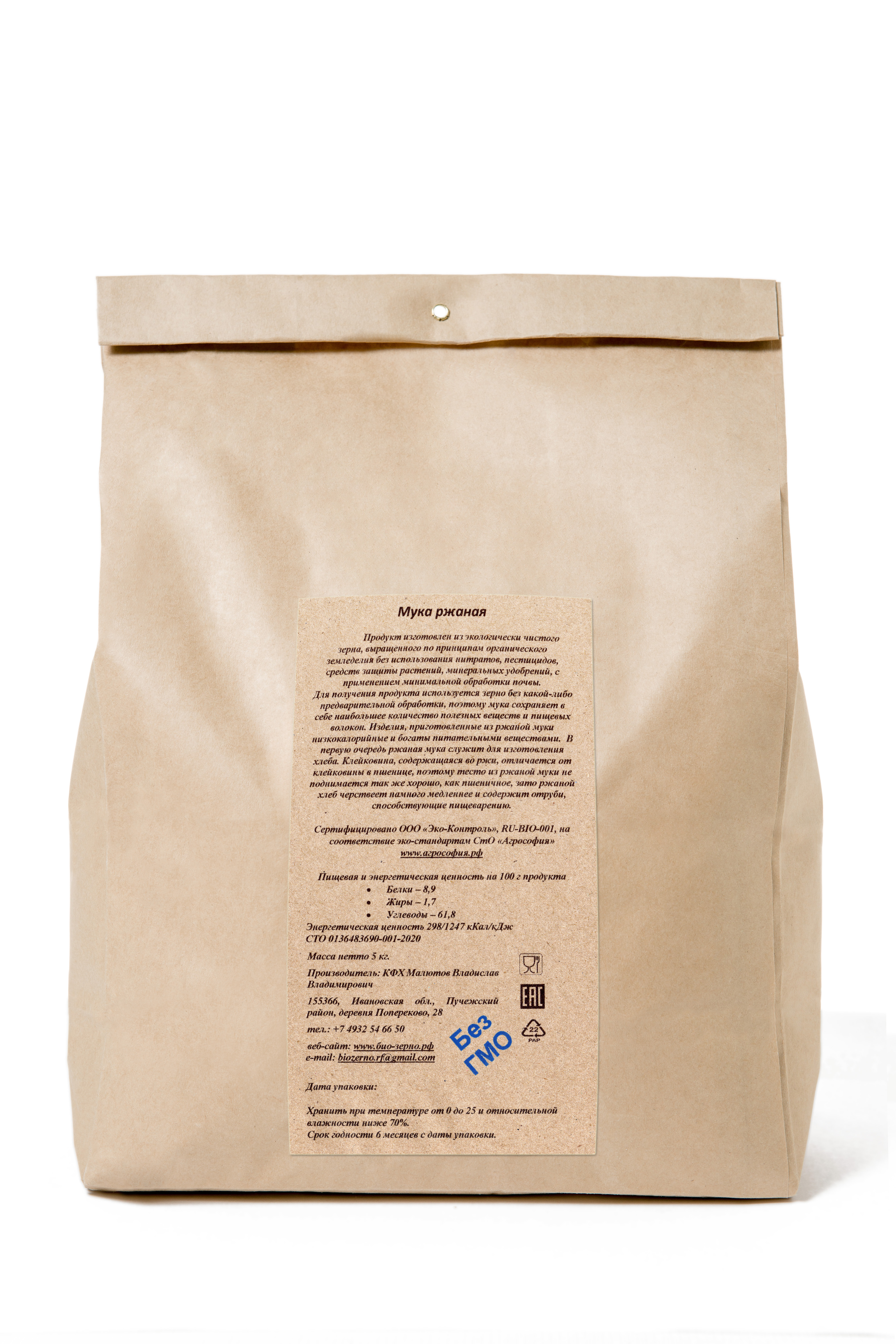 Продукт изготовлен из экологически чистого зерна, выращенного по принципам органического земледелия без использования нитратов, пестицидов, средств защиты растений, минеральных удобрений с применением минимальной обработки почвы. Сертифицировано ООО "Эко-Контроль", RU-BIO-001, на соответствие эко-стандартам СтО "Агрософия"
