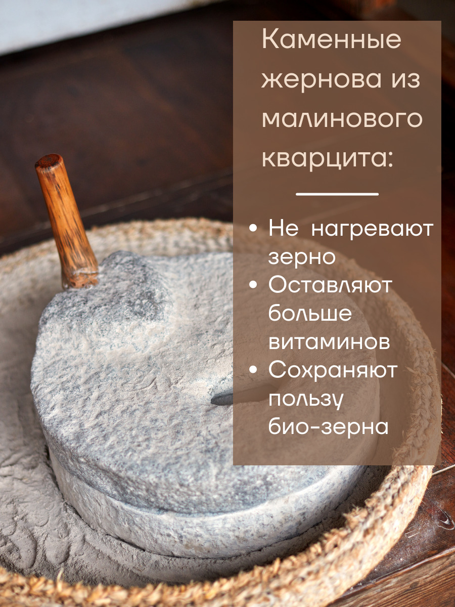 Изготовлено из цельных зёрен ржи. Бережный помол на мельнице с каменными жерновами. Благодаря этому мука не перегревается и сохраняет в себе все части зерна и максимум полезных веществ: питательный эндосперм, богатый витаминами зерновой зародыш и оболочку зерна, содержащую клетчатку.