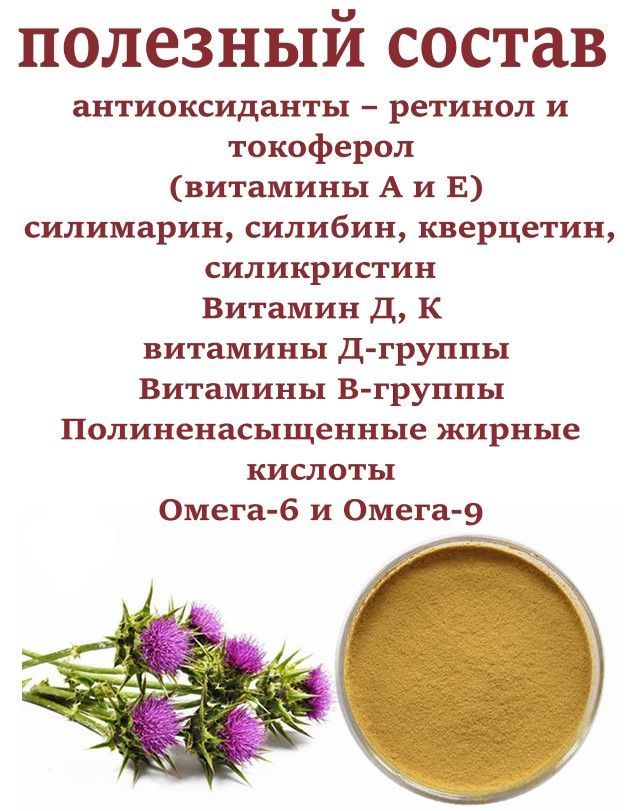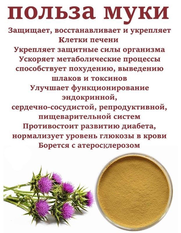 Мука из семян растения содержит флавоноид силимарин – вещество, оказывающее комплексное воздействие на печень человека. Силимарин участвует в обновлении, регенерации, укреплении и питании клеток органа.Благодаря его воздействию, восстанавливается структура печени, устраняются последствия негативного воздействия токсинов, орган очищается и оздоравливается.