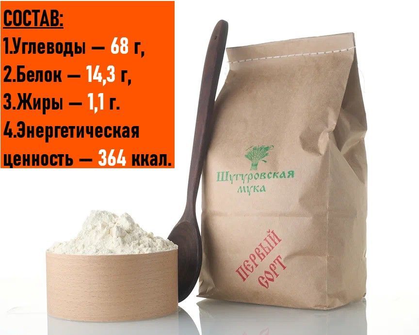 Описание: Мука пшеничная 1 сорта из Шугуровского зерна, выращенного без использования химических удобрений и ядохимикатов. Не подвергалась химическому отбеливанию или другой обработке. Мука 1 сорта содержит немного больше минеральных веществ, витаминов, клетчатки, чем мука высшего сорта, и поэтому считается полезнее. Мука 1 сорта отлично подходит для несдобной выпечки — хлеба. В 100г. муки содержится: углеводы — 68 г, белок — 14,3 г, жиры — 1,1 г. Энергетическая ценность — 364 ккал.