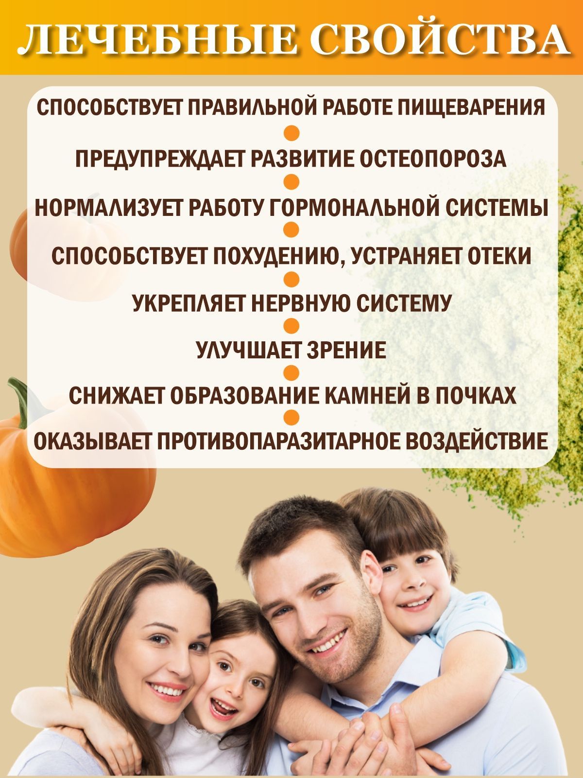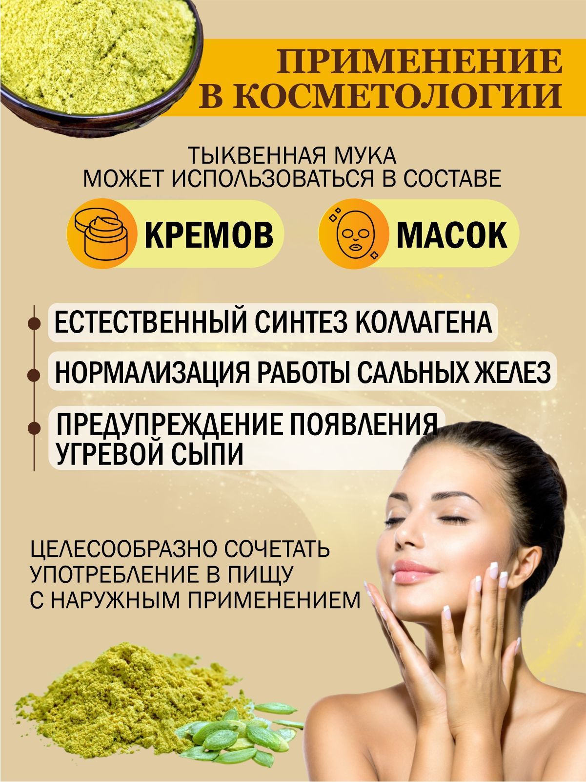 Тыквенная мука – органический белковый продукт, чемпион по содержанию ЦИНКА! Обогащенный , полезными для здоровья, полиненасыщенными жирными кислотами, витаминами, минералами, аминокислотами и клетчаткой. Благотворно влияет на репродуктивную систему Мужчин и Женщин. Налаживает работу ЖКТ, очищает кишечник от шлаков и токсинов. Оказывает мягкий, послабляющий эффект. Обладает глистогонным действием. Восстанавливает защитные функции организма. Восполняет суточную норму белка. Тыквенную муку добавляют в крем супа, каши, оладьи, мясные и овощные горячие блюда, соусы, подливы, протеиновые коктейли, молочные смузи и напитки из свежих овощей. Так же употребляют самостоятельно по 2-3 чайные ложки в день. Тыквенная мука получена экологически чистым способ, не содержит ГЛЮТЕН и ГМО Обогащайте свой рацион с пользой для здоровья. Мы ВСЕМ рекомендуем этот природный продукт!!!
