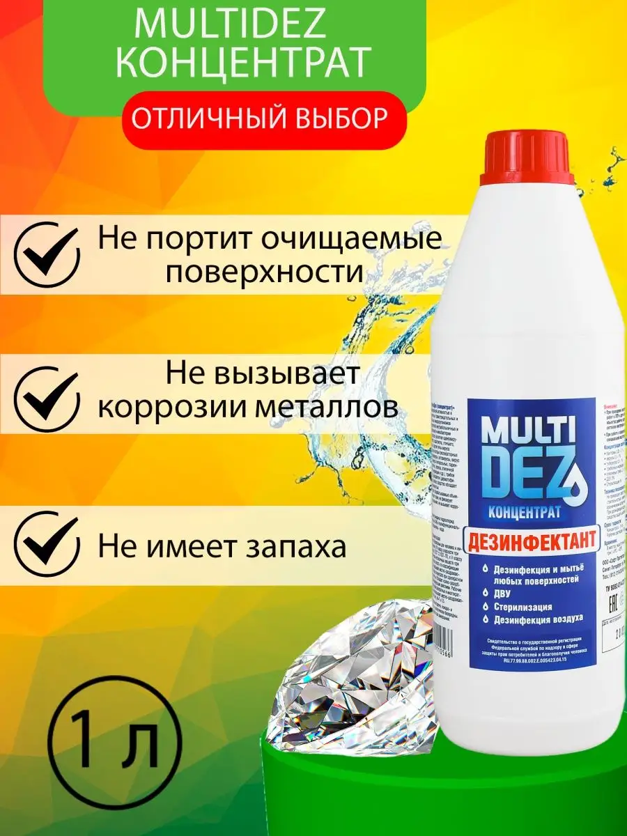 Описание: Подходит для очищения любой поверхности. Не токсично, уборку можно производить в присутствии человека и животных. Эффективно уничтожает бактерии, вирусы, любые виды грибка. не портит очищаемые поверхности; не обесцвечивает ткани; не фиксирует органические загрязнения; не вызывает коррозии металлов; не имеет запаха. Срок годности: в невскрытой упаковке производителя — 5 лет, рабочих растворов — 28 дней. Растворы средства МультиДез (концентрат) готовят в емкости из любого материала путем смешивания средства с водопроводной водой. Дезинфекцию изделий медицинского назначения, в том числе совмещенную с их предстерилизационной очисткой, осуществляют в пластмассовых или эмалированных (без повреждения эмали) емкостях с закрывающимися крышками. Используют рабочие растворы средства комнатной температуры.