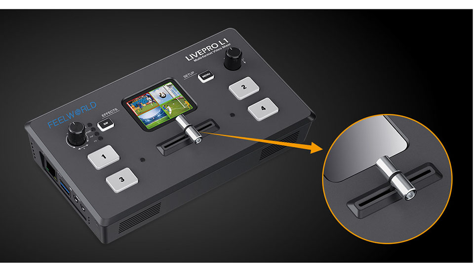 T-Bar LIVEPRO L1 V1 поддерживает 14 эффектов перехода и переключения сигналов. В режиме T-Bar при нажатии зеленой кнопки он будет мигать и нажмите T-Bar до конца (влево или вправо), источник будет переключаться с выбранным эффектом перехода. После переключения зеленый становится красным. Он очень подходит для переключения видеоэффектов небольших сцен на открытом воздухе, чтобы удовлетворить потребности переключения видео, такие как радио и телевидение, спортивные мероприятия на открытом воздухе, производство школьной курсовой посуды и т. Д.