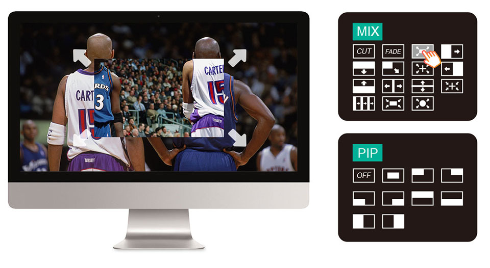 Одним из преимуществ LIVEPRO L1 V1 являются Профессиональные производственные ценности, которые возможны с использованием ряда встроенных видеоэффектов. Нажмите кнопку SW, чтобы открыть меню эффекта перехода, используйте ручку, чтобы выбрать желаемый значок эффекта перехода, и нажмите ручку для подтверждения. Вменю «вырезать» обеспечивает мгновенный срез при переключении источника. Вы также можете выбрать тип эффекта, который вы хотите, включая смешивание, которое делает плавный переход между источниками, и погружение, которое исчезает через цвет во время перехода. Меню in MODE, позволяющее настраивать 0 .5S ~ 5,0 с. Кроме того, вы можете выбрать режим PIP.