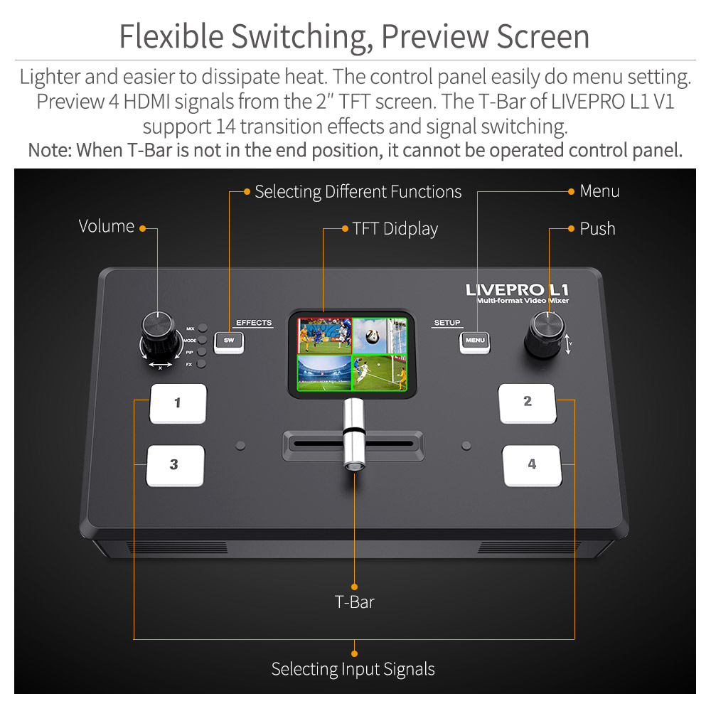 LIVEPRO L1 V1 имеет изысканную и компактную панель управления. 4 кнопки предназначены для выбора входных сигналов, зеленое мигание означает, что сигнал был выбран, затем переключите T-Bar, выбранный сигнал будет легко отображаться на экране, после переключения Зеленая кнопка изменилась на красную. Кнопка МЕНЮ предназначена для настройки меню, кнопка SW предназначена для выбора различных функций, таких как Микширование, PIP, настройка времени перехода и другие функции. Левая ручка предназначена для управления громкостью голоса, правая ручка также предназначена для настройки меню. С экрана TFT мы можем предварительно просмотреть 4 сигнала HDMI и легко настроить меню.