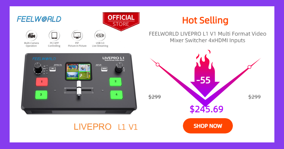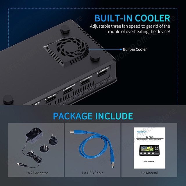 FEELWORLD L2 PLUS is the portable full feature live switching & streaming solution.The large 5.5-inch LCD touch screen make it easy to complete various operations via a finger tapping. You can preview 4 cameras, PST and PGM in real time.L2 PLUS is upgraded from LIVEPRO L1. In addition, it supports PTZ camera control, which can well control the rotation, focus and zoom of the camera.The built-in chroma key function,is perfect for news or on-set presentation work. You can even use it for title overlays by creating graphics to make the live broadcasting more professional.Even the interviews and presentations become easy through the separate mic!
