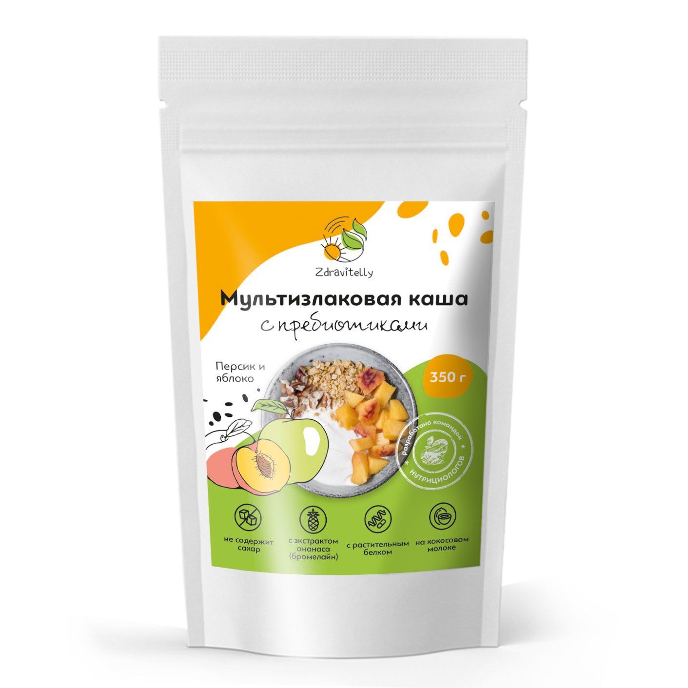 Мультизлаковая овсяная каша на растительном протеине быстрого приготовления c пребиотиком со вкусом персик и яблоко, ТМ Zdravitelly, 350 гр, 10 порций, без сахара, безмолочная, с кусочками фруктов