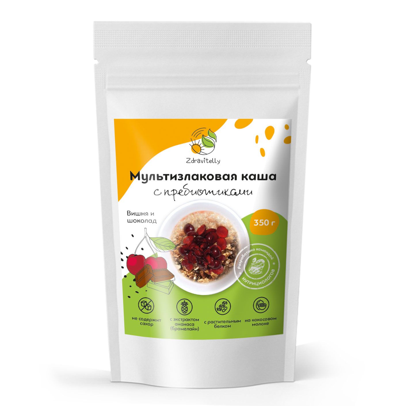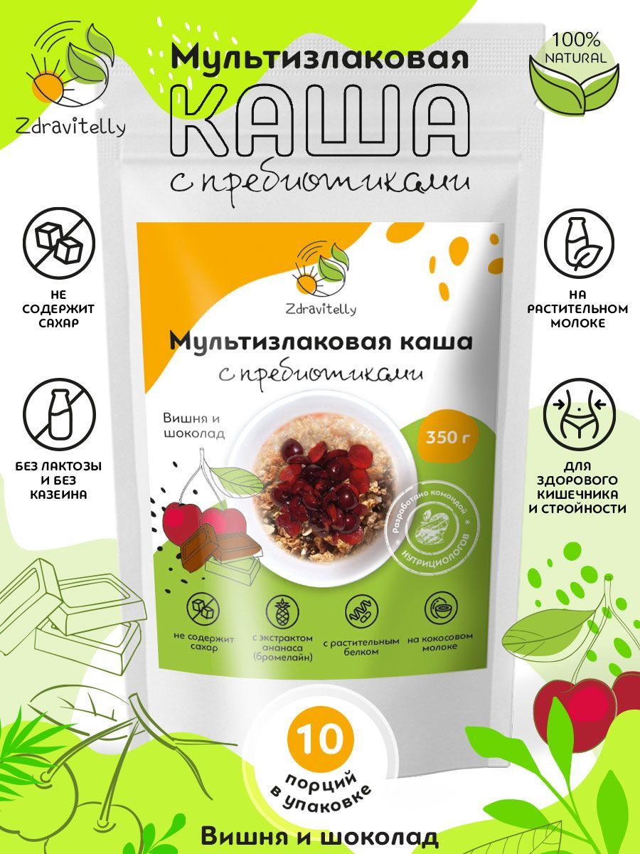 Мультизлаковая овсяная каша на растительном протеине быстрого приготовления c пребиотиком со вкусом вишня и шоколад, ТМ Zdravitelly, 350 гр, 10 порций, без сахара, безмолочная, с кусочками фруктов