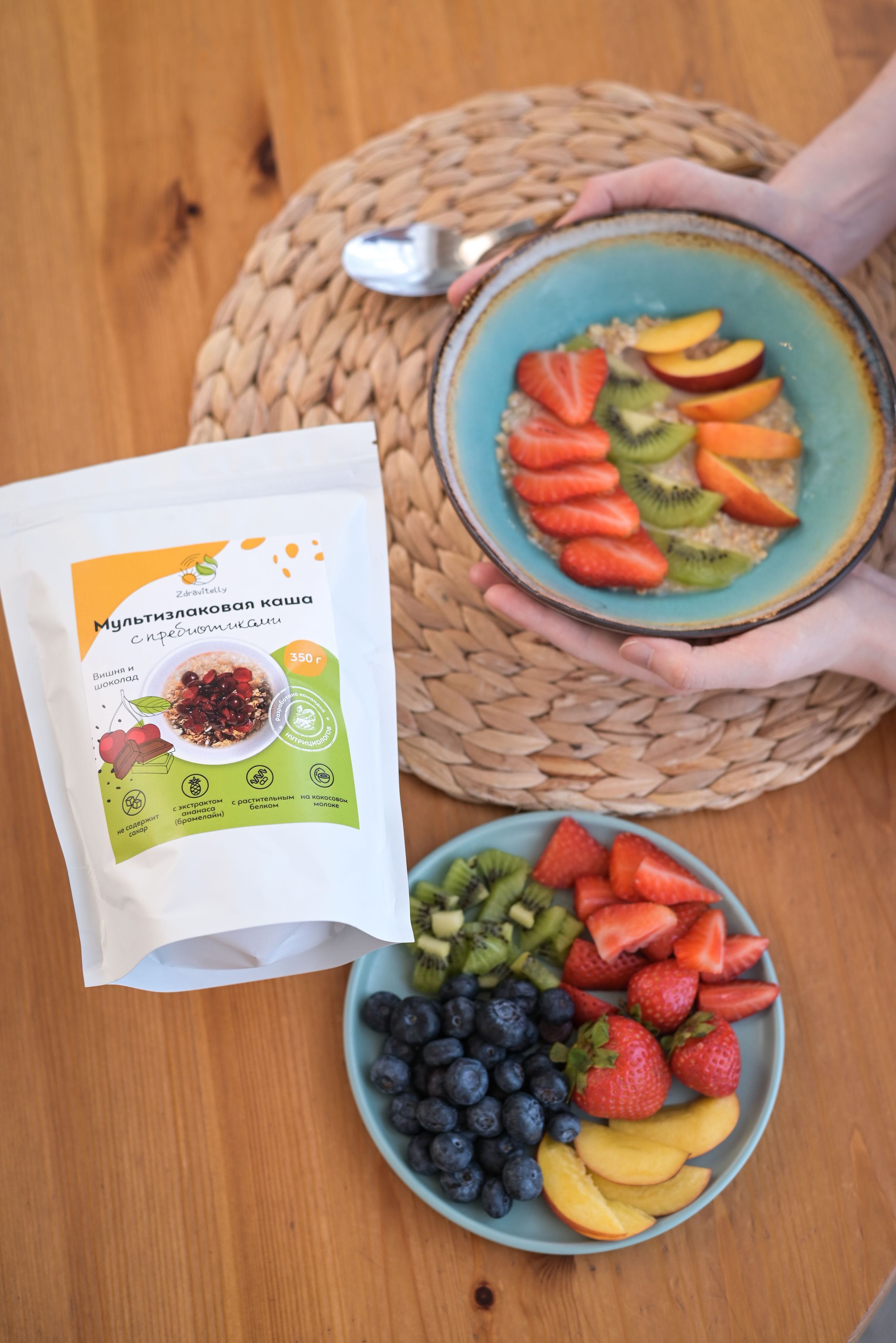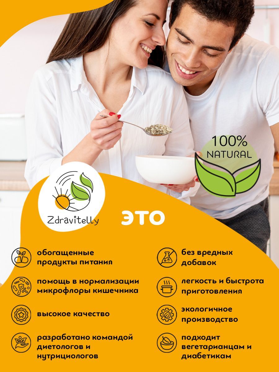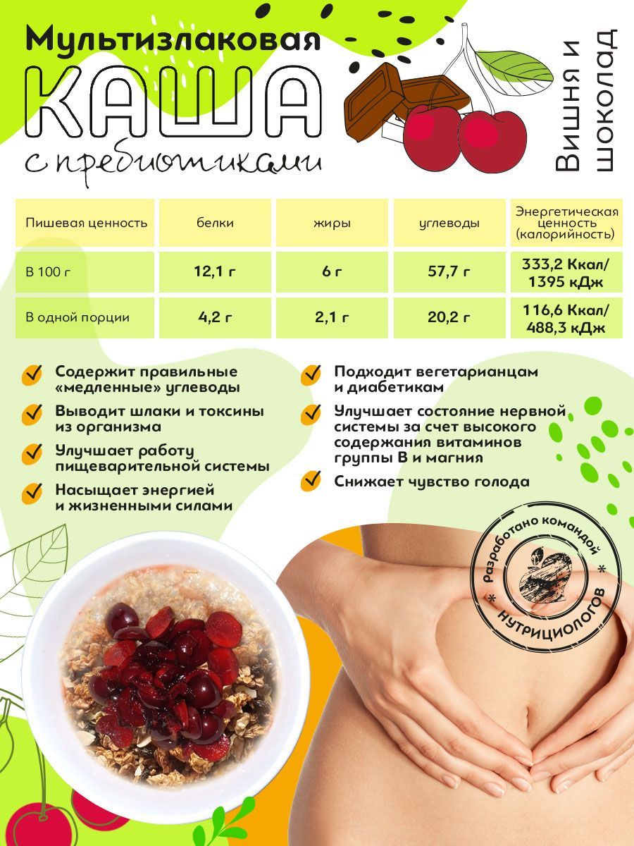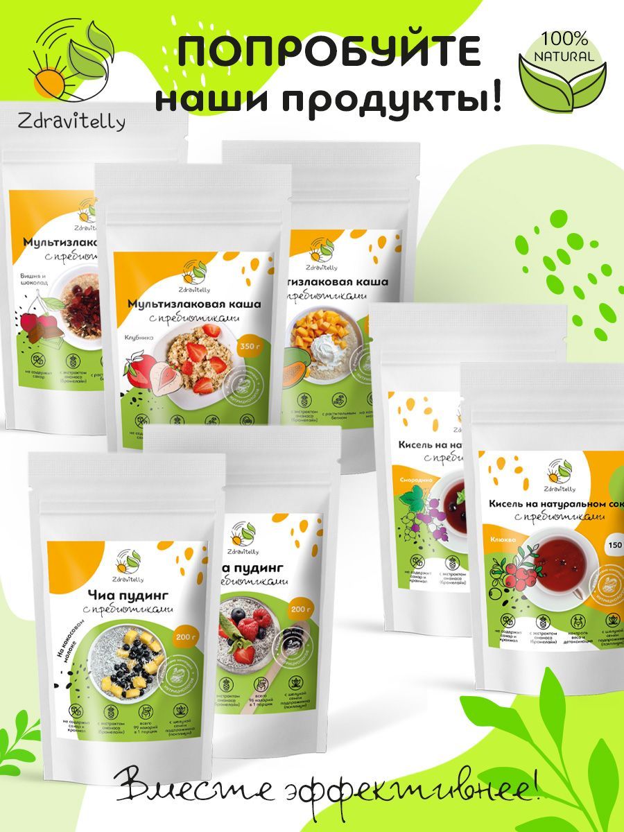 Описание: Мультизлаковая каша Мы создали полезную и питательную кашу на основе злаков и растительного белка, чтобы вы могли насладиться аппетитным завтраком и сэкономить время. Наш завтрак богат растительным белком, пищевыми волокнами и пребиотиками, что поможет вам начать день с заботой о своем здоровье. Вместо сахара и фруктозы мы используем безопасные подсластители, такие как эритрит, экстракт стевии и изомальт. Эти подсластители имеют минимальное количество калорий, выдерживают термическую обработку и самое важное ― они не повышают уровень сахара и инсулина в крови. Что содержит Овсяные и ржаные хлопья, амарант, гороховый протеин, кокосовое молоко, инулин и экстракт ананаса (бромелайн). Чем помогает Овсяные хлопья премиум класса отличаются от обычных хлопьев тем, что они производятся из отборного овса. Кроме того, в процессе производства таких хлопьев используются инновационные технологии, которые позволяют сохранить все полезные свойства зерна. Благодаря этому, они являются более полезным и питательным продуктом для нашего организма. Регулярное употребление ржаных хлопьев помогает восстановить работу пищеварительной системы, снижает объемы желчи и кислотность в кишечнике, что является эффективной профилактикой заболеваний желудочно-кишечного тракта, включая онкологические. У этого продукта есть еще одно полезное свойство - оно способствует улучшению работы нервной системы и выводу токсинов и пестицидов из организма. Амарантовая мука содержит фитостеролы, понижающие холестерин, лизин для усвоения кальция и поддержания здоровья кожи, сухожилий, хрящей и костей, цинк для иммунной системы и клетчатку для контроля аппетита. Гороховый протеин, в отличие от молочного или сывороточного белка, имеет более легкое усвоение и не вызывает негативных эффектов, таких как агрессивное воздействие на работу кишечника или появление высыпаний. Кокосовое молоко оказывает положительное воздействие на различные системы организма. Оно способствует поддержанию здоровья костей и зубов, снижает уровень вредного холестерина, повышает содержание гемоглобина, улучшает обмен веществ и помогает выводить токсины, включая тяжелые металлы. Кроме того, кокосовое молоко восстанавливает баланс микрофлоры кишечника и нормализует пищеварение. Оно также способствует улучшению состояния кожи и волос, а также регулирует уровень сахара в крови. Природный полисахарид и пребиотик пребиотик инулин улучшает усвоение полезных микроэлементов, таких как кальций, магний, железо, медь и фосфор. Он также укрепляет иммунитет и повышает обменные процессы в организме. Кроме того, инулин способствует восстановлению поврежденных тканей печени. Бромелайн помогает снизить вес, улучшить обменные процессы и ускорить метаболизм. Он также обладает противовоспалительными свойствами для суставов и может снизить риск тромбообразования. Кроме того, бромелайн помогает расщеплять белки, улучшает работу ЖКТ, способствует восстановлению после физических нагрузок и укрепляет иммунитет. Как употреблять Приготовление займет всего несколько минут, при этом чувство сытости будет с вами надолго. Можно приготовить дома, на работе, в дороге ― залейте сухую смесь горячей водой или молоком и подождите несколько минут. Готовый завтрак Zdravitelly (Здравителли) подходи