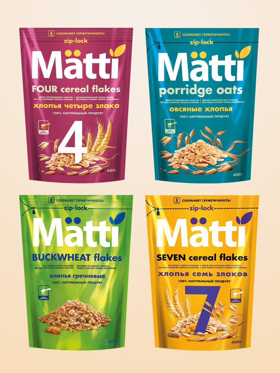 Мультизлаковый набор хлопьев быстрого приготовления Matti (овсяные 400 г + гречневые 375 г + 7 злаков 400 г + 4 злака 400 г), 4 пачки
