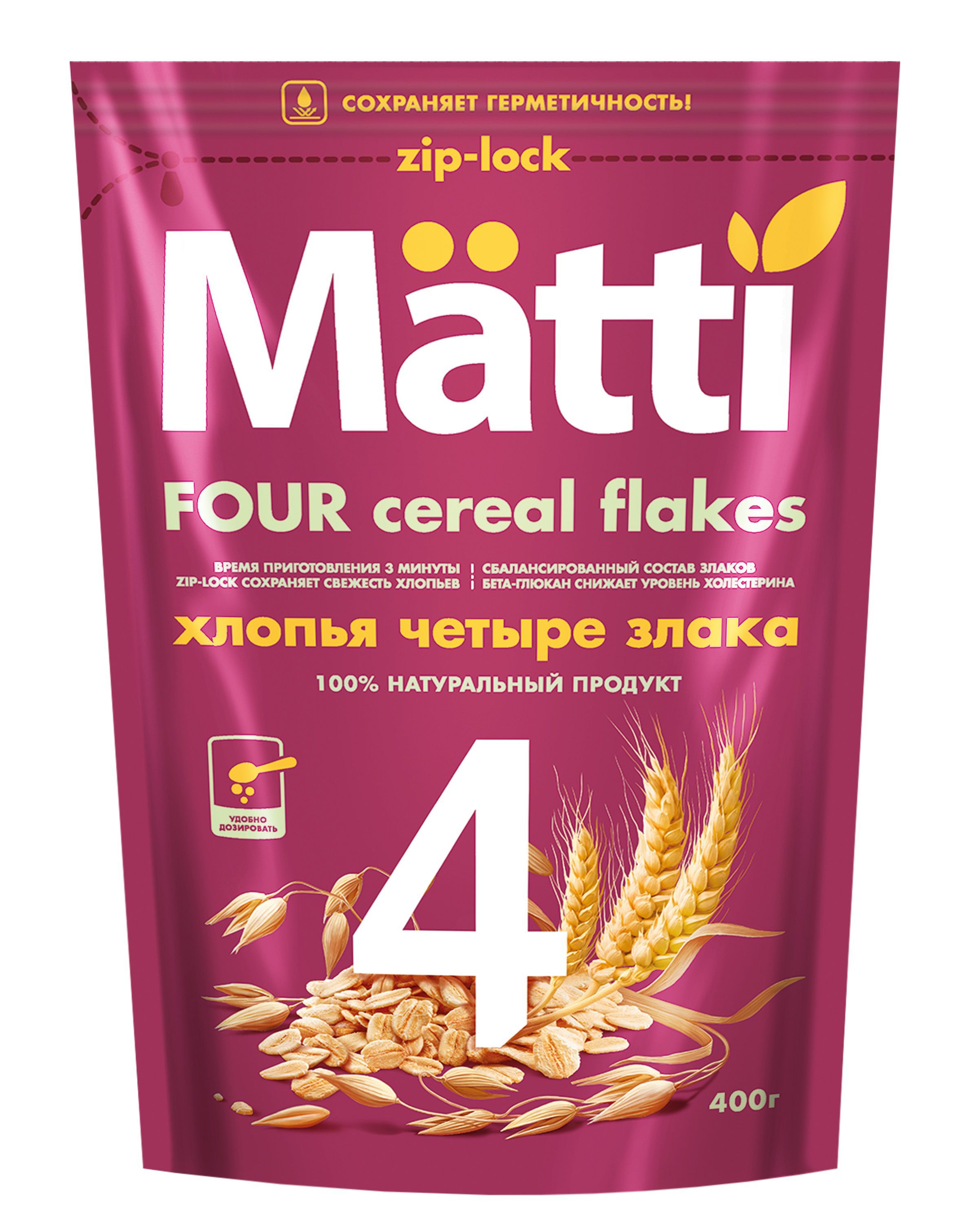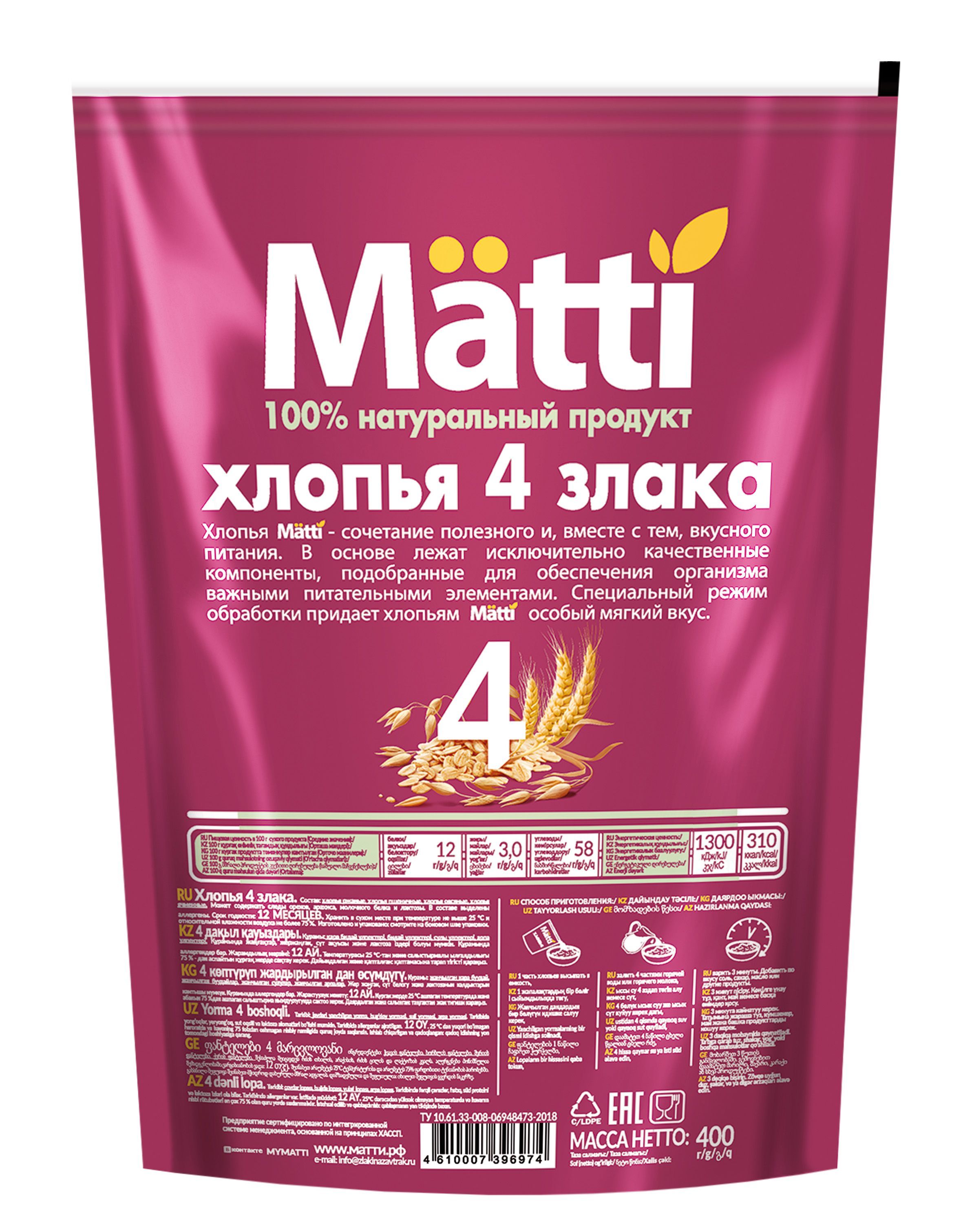• Хлопья 4 злака Matti (400 г) - быстрого приготовления 4 злака (400 г) - это смесь из специально подобранного соотношения ржаных, овсяных, пшеничных и ячменных хлопьев. Каша гармонично сочетает натуральность и отличный вкус. Пищевая ценность в 100 г сухого продукта: Белки - 12 г, Жиры - 3 г, Углеводы - 58 г. Энергетическая ценность: 310 ккал.