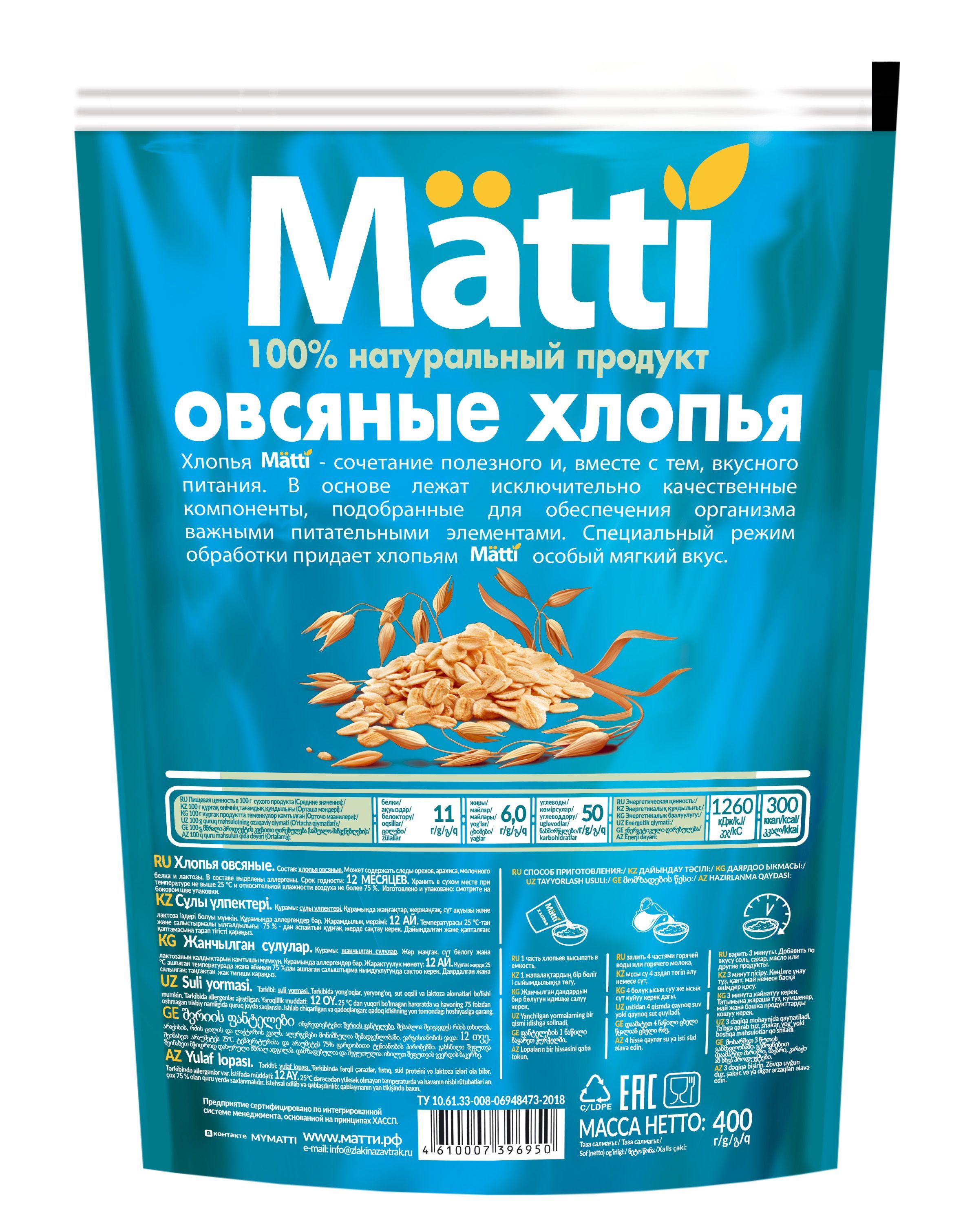 • Хлопья овсяные Matti (400 г) - хлопья быстрого приготовления (3 минуты). Особая технология производства сохраняет 95% полезных качеств данного продукта. Каша из овсяных хлопьев обладает мягким сливочным вкусом, благодаря специальной обработке овса. Пищевая ценность в 100 г сухого продукта: Белки - 11 г, Жиры - 6 г, Углеводы - 50 г. Энергетическая ценность: 300 ккал.
