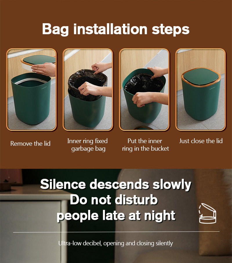 Этот мусорный бак очень тихий при открытии и закрытии. Потому что его крышка медленно опускается при закрытии. Поэтому, даже если вы используете его ночью, вам не нужно беспокоиться о том, что он нарушит сон вашей семьи.