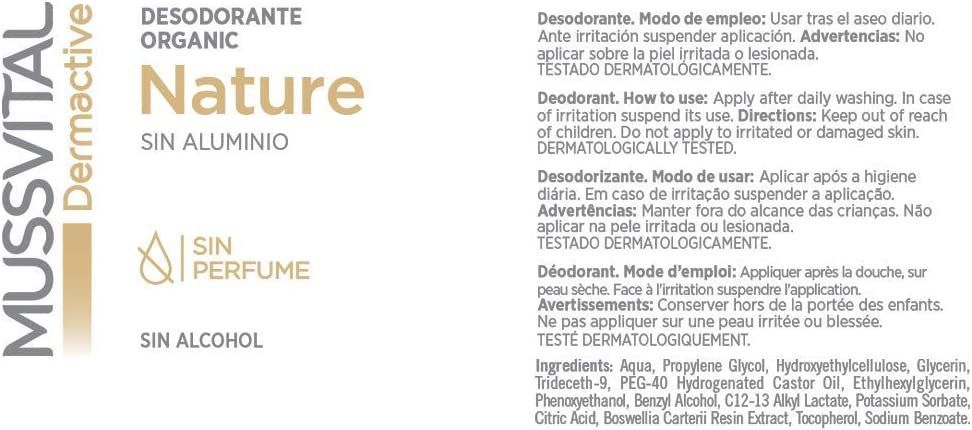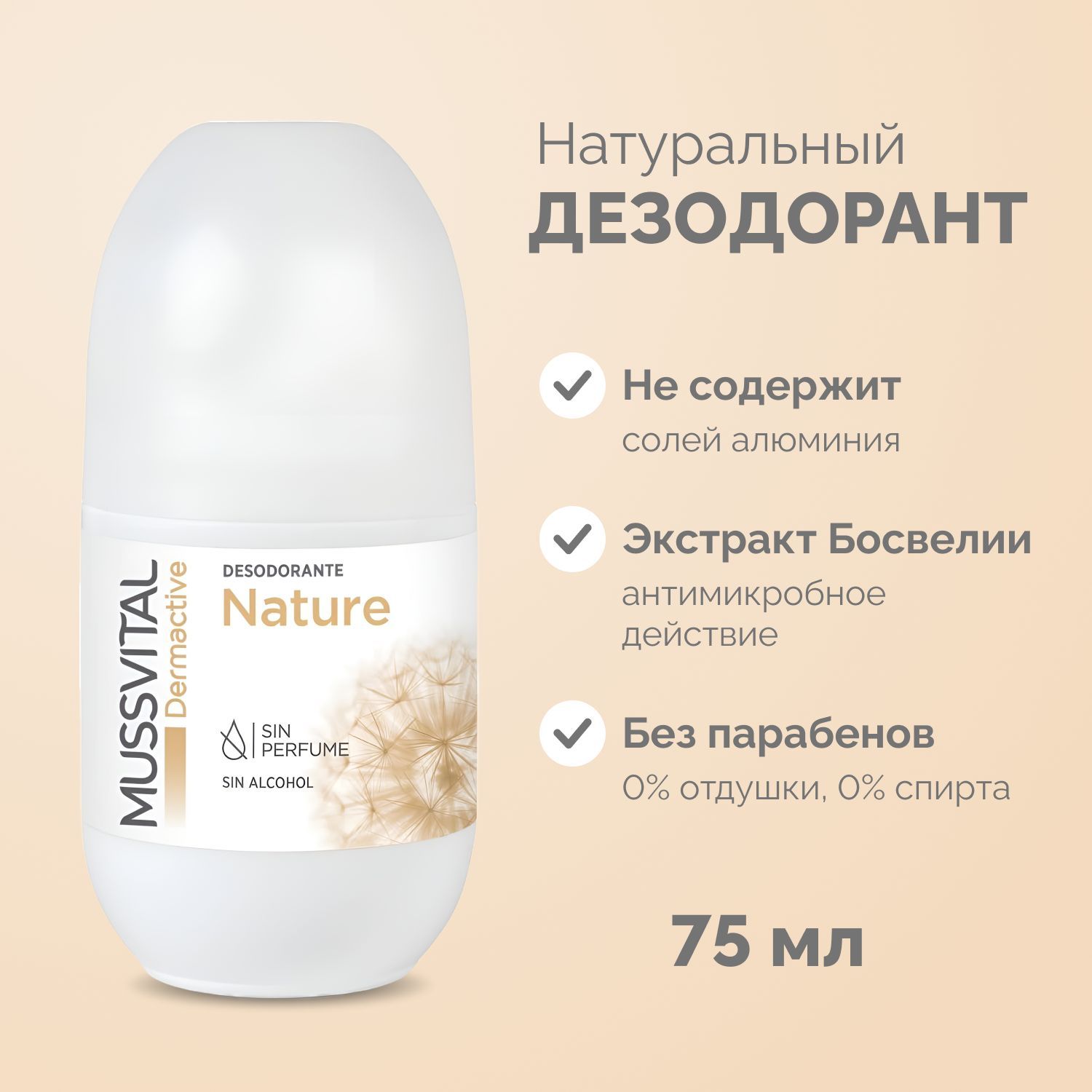Mussvital DERMA Nature Роликовый дезодорант для сухой и чувствительной кожи Nature не содержит спирта, яркого запаха, алюминия, парабенов, талька, 75мл