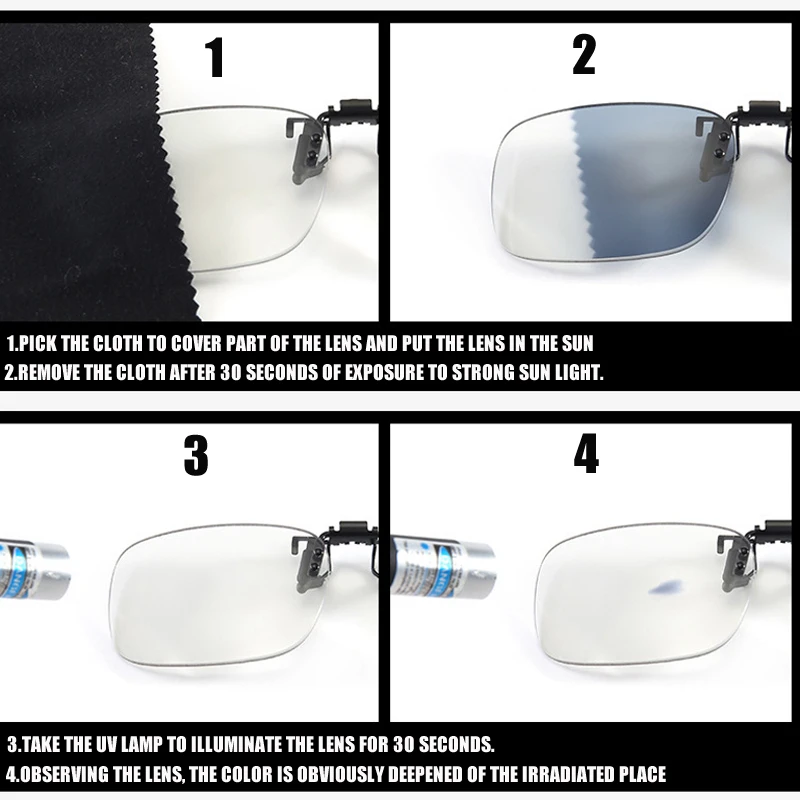 • Фотохромные прогрессивные многофокальные флип-очки, можно использовать в качестве солнцезащитных очков. Цвет линз изменится в зависимости от сильного солнечного света