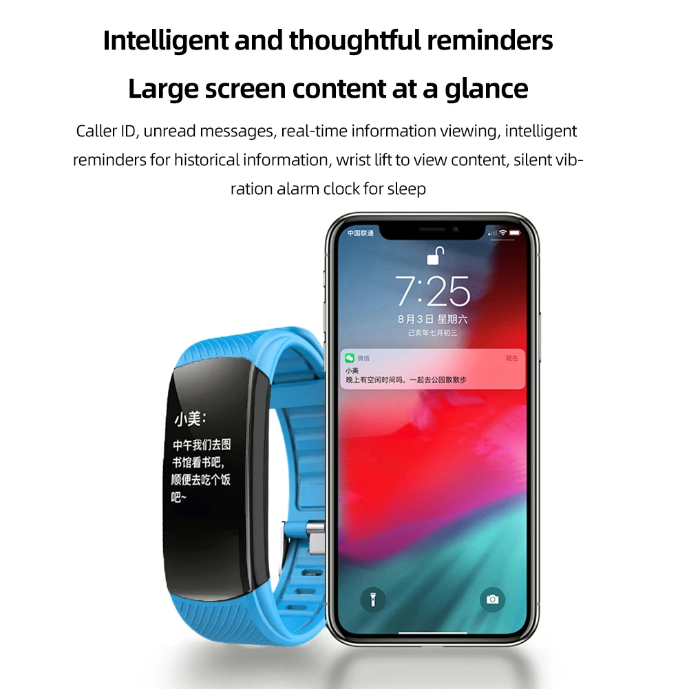 2. Цветной экран:Благодаря цветному дисплею умный браслет позволяет пользователям четко просматривать данные о своей активности, частоту сердечных сокращений, артериальное давление, уровень кислорода в крови и другую информацию о мониторинге здоровья.