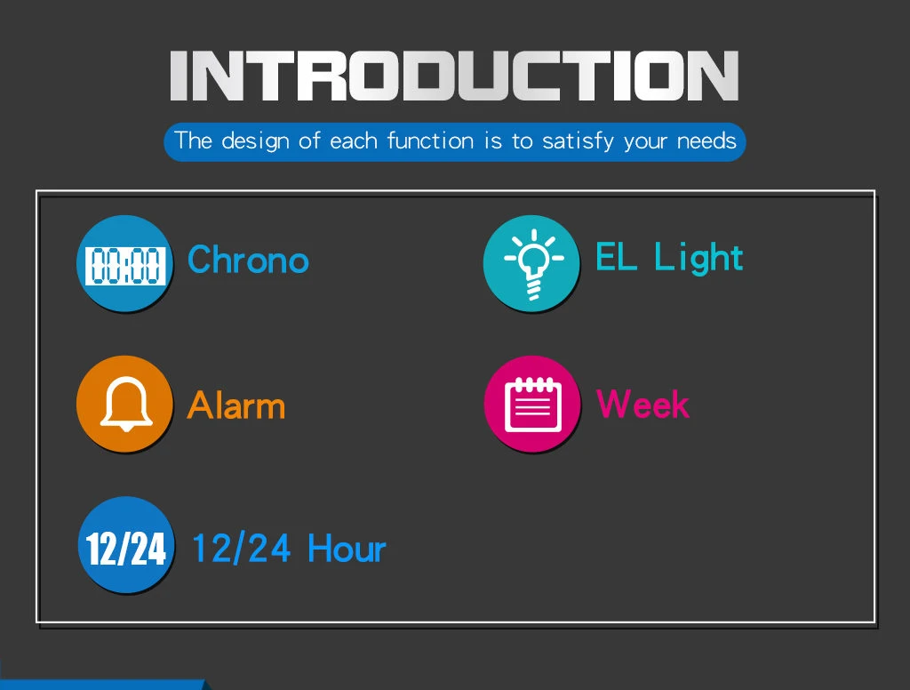 Функция: еженедельные шоу, Ночной светильник, будильник, всегда отчет, водонепроницаемость 30 м, остановка хода, 12/24 часов.